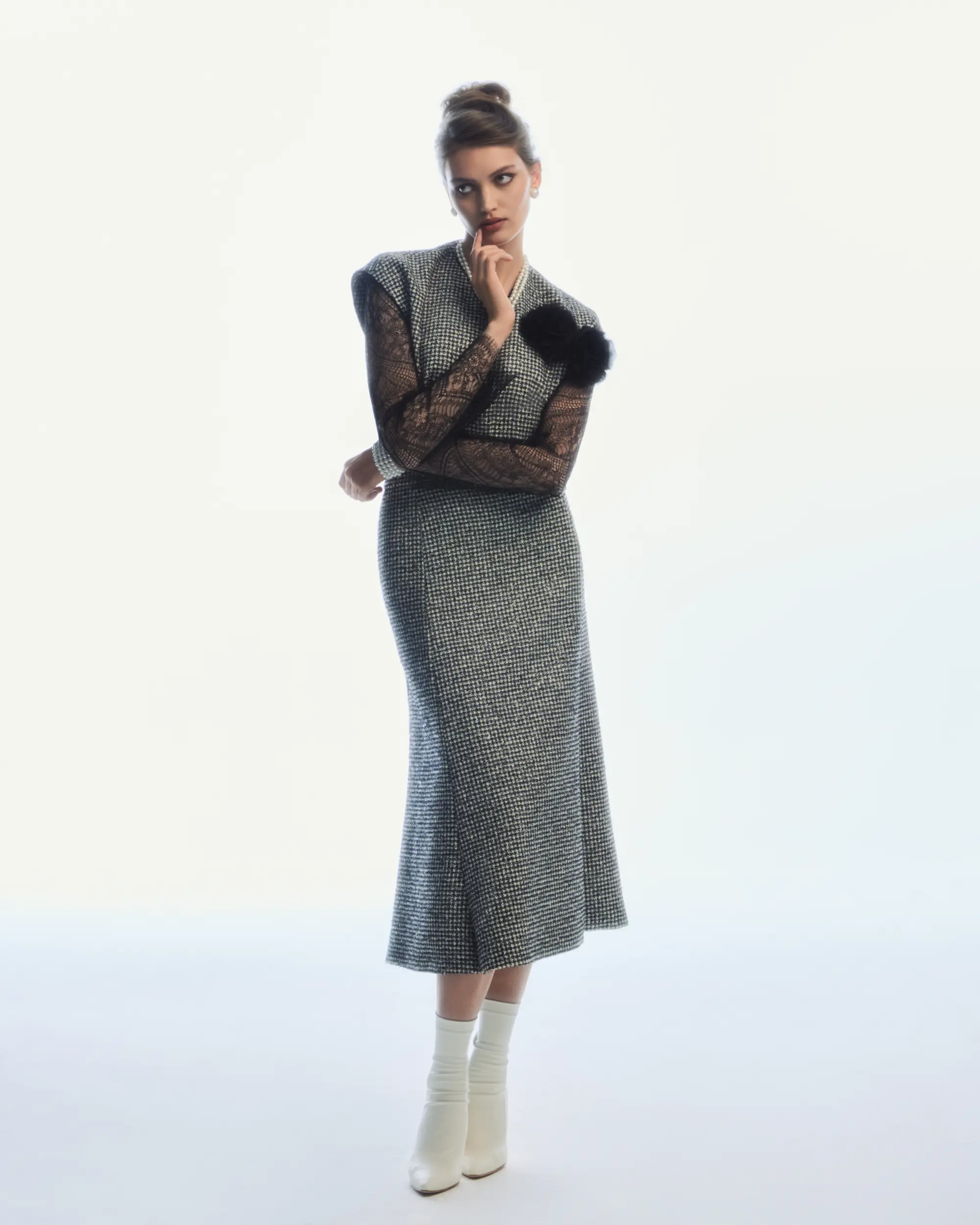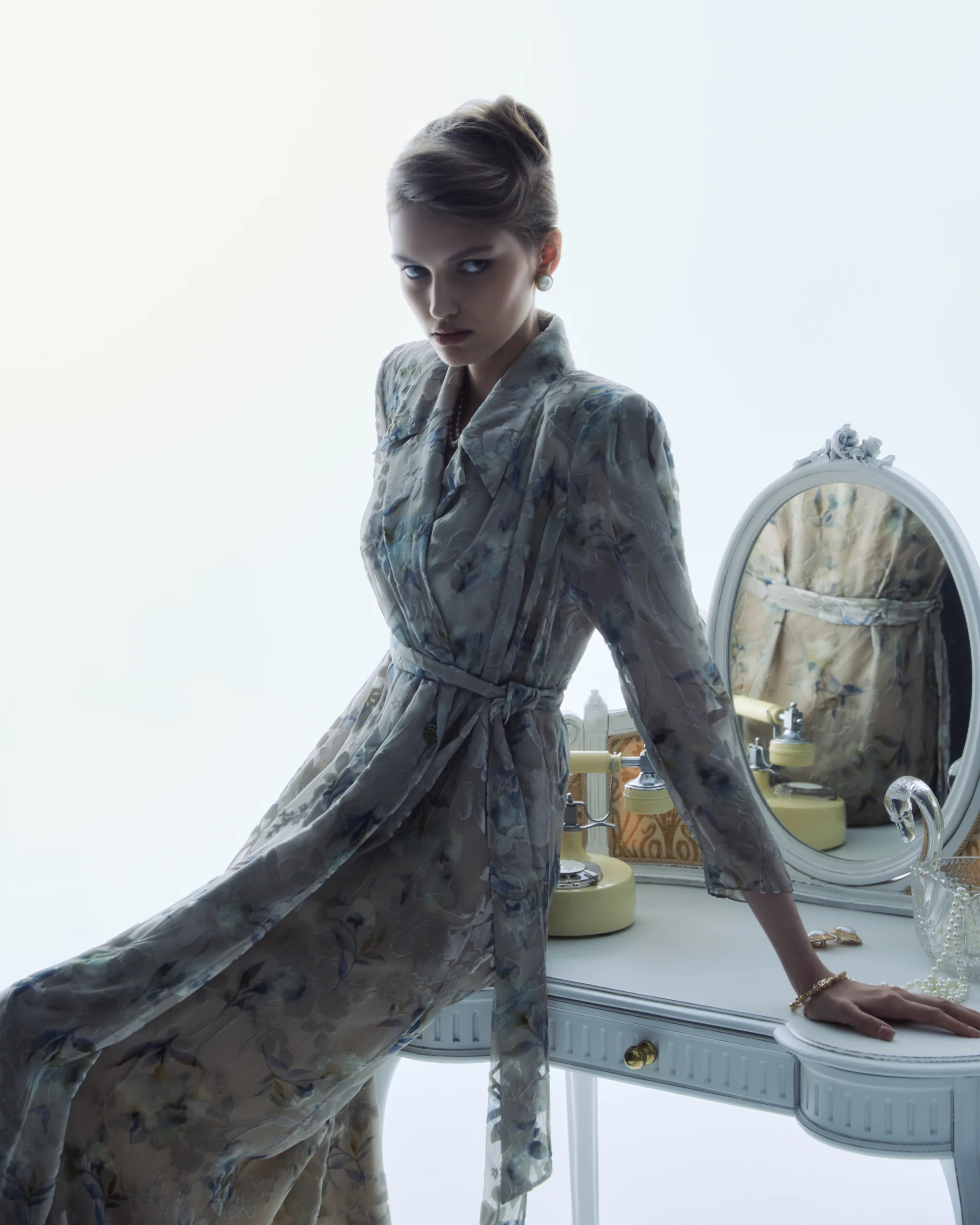 Платье из молочного шёлкового панбархата с фактурным орнаментом