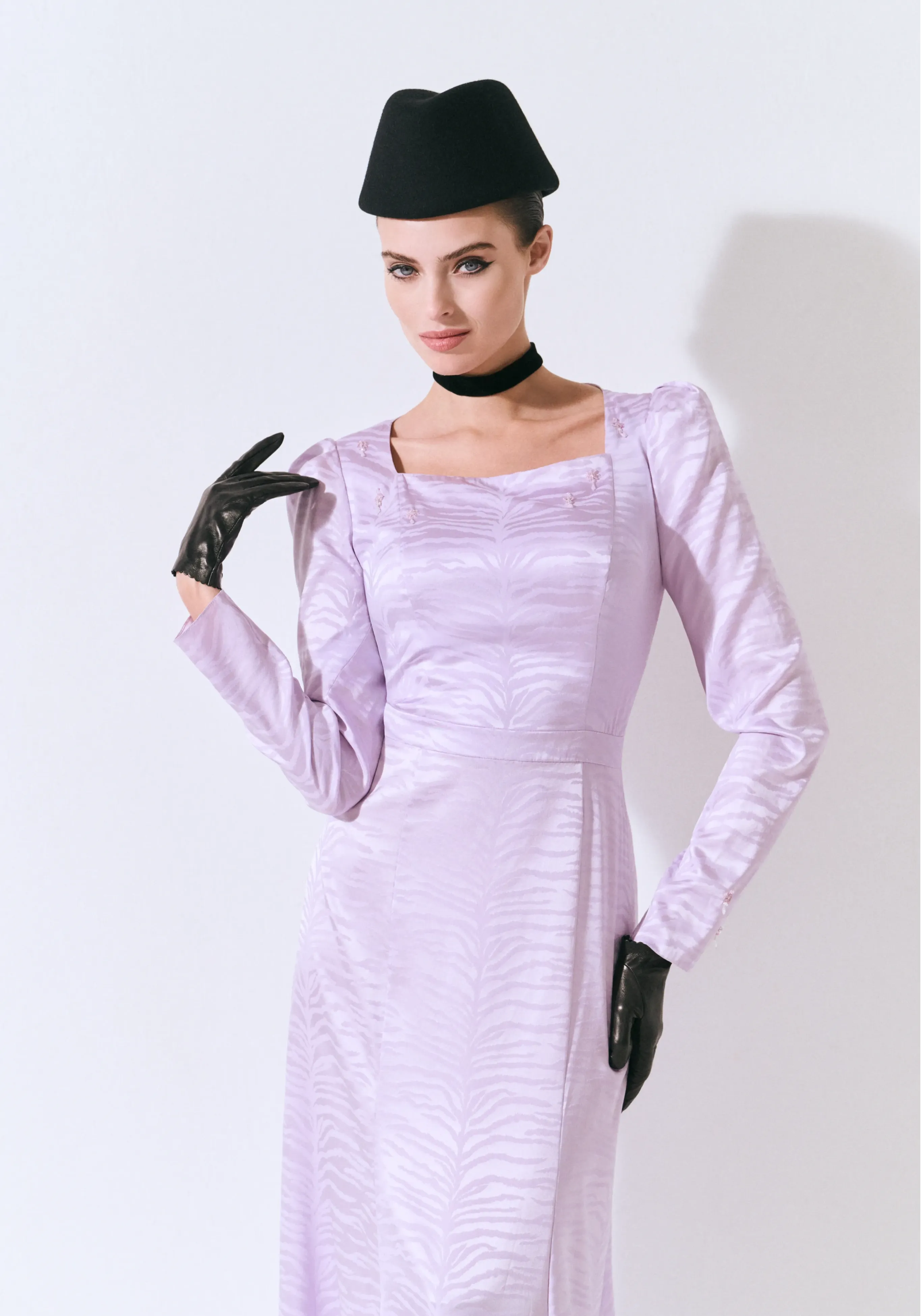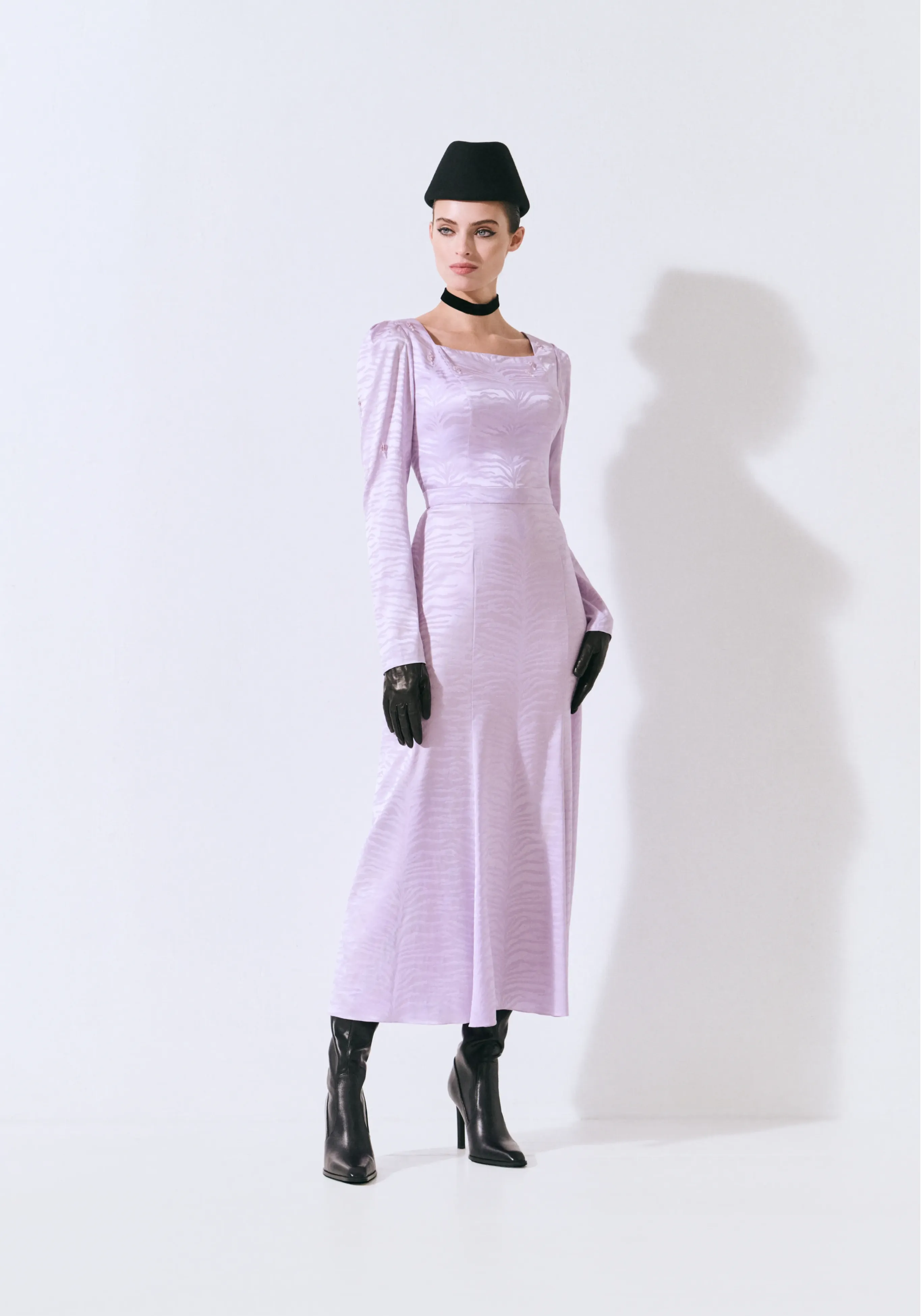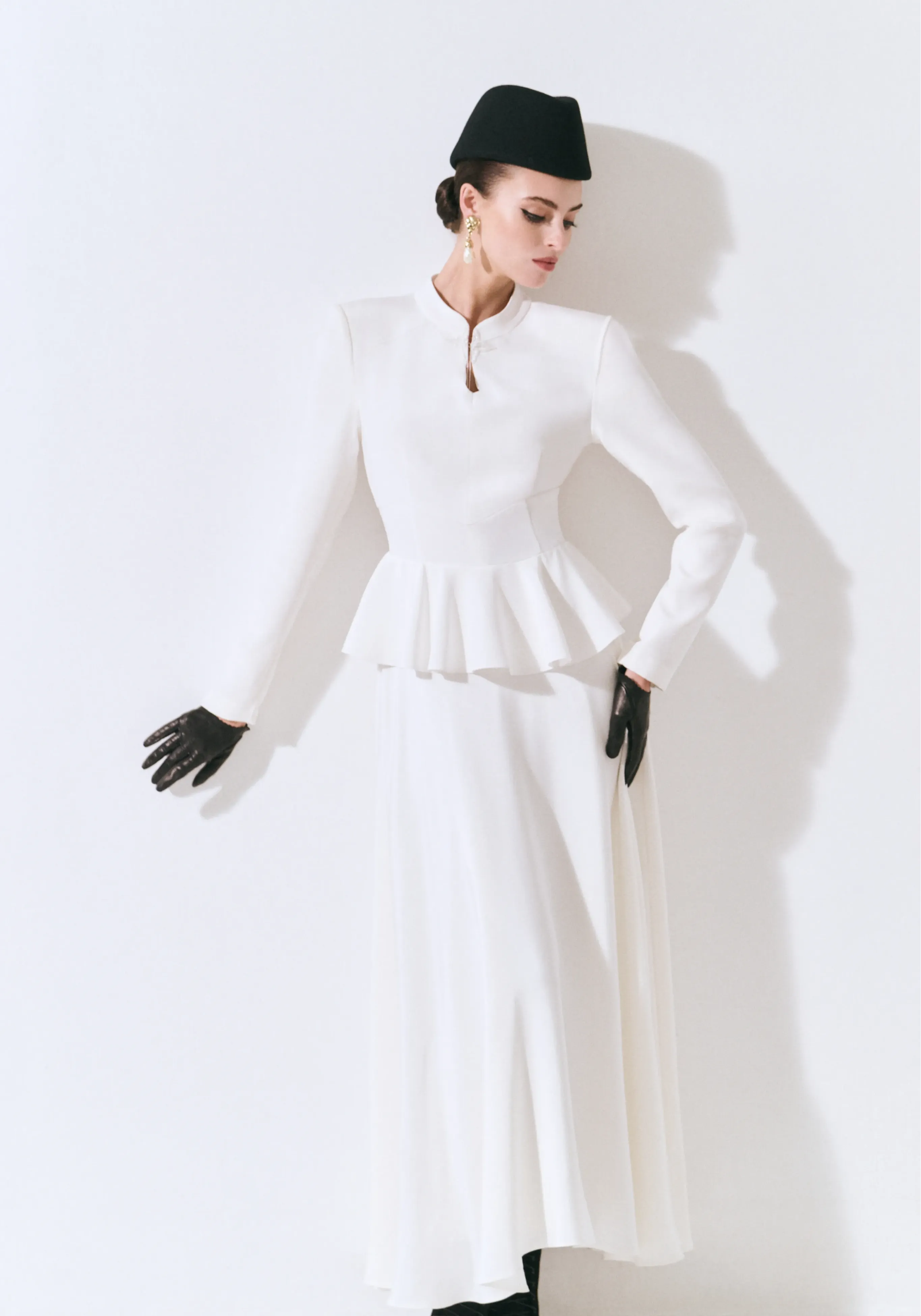Платье из шелкового кади с баской и авторской вышивкой