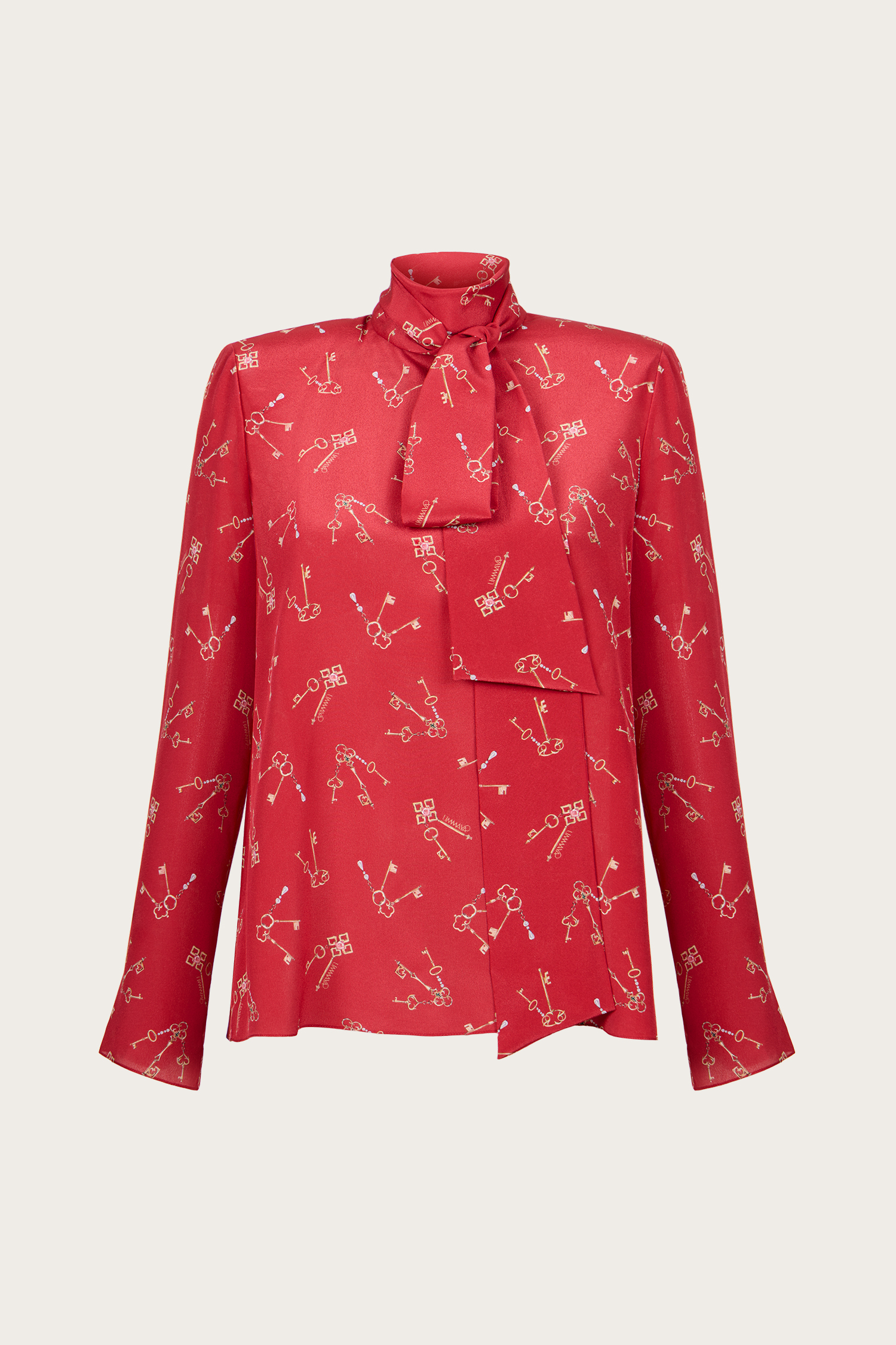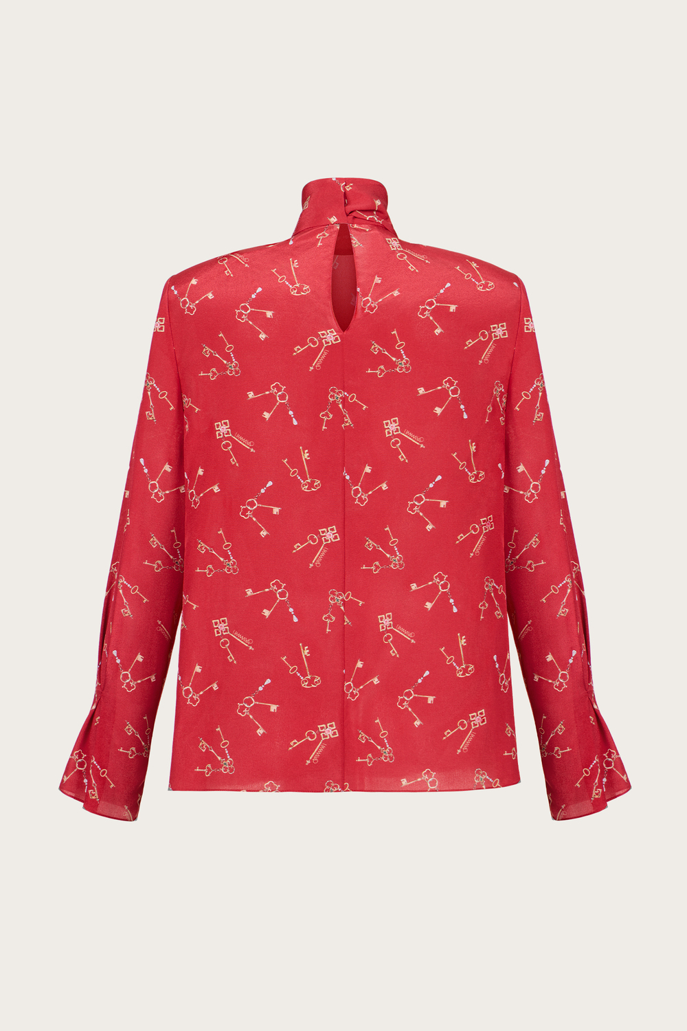 Блуза из красного шелка с авторским принтом. Воротник - бант. Застежка на пуговицу по спинке. Только сухая чистка. Сделано в России.