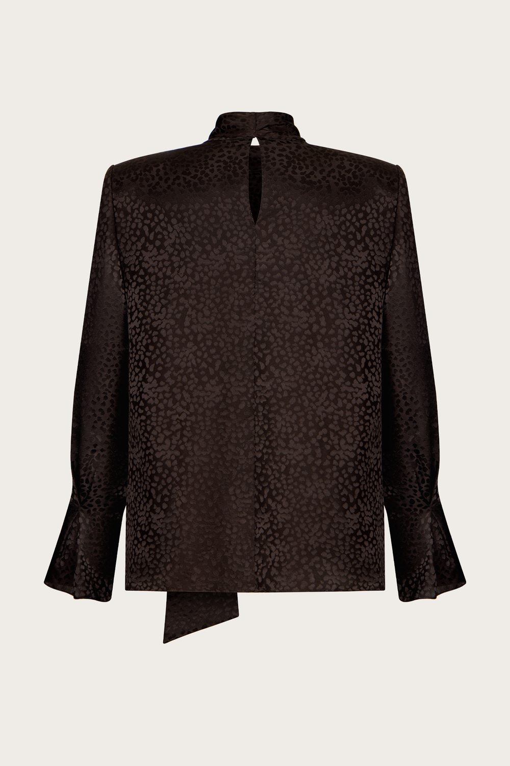 Блуза из шоколадного жаккардового шелка. Воротник - бант. Застежка на пуговицу по спинке. Только сухая чистка. Сделано в России.