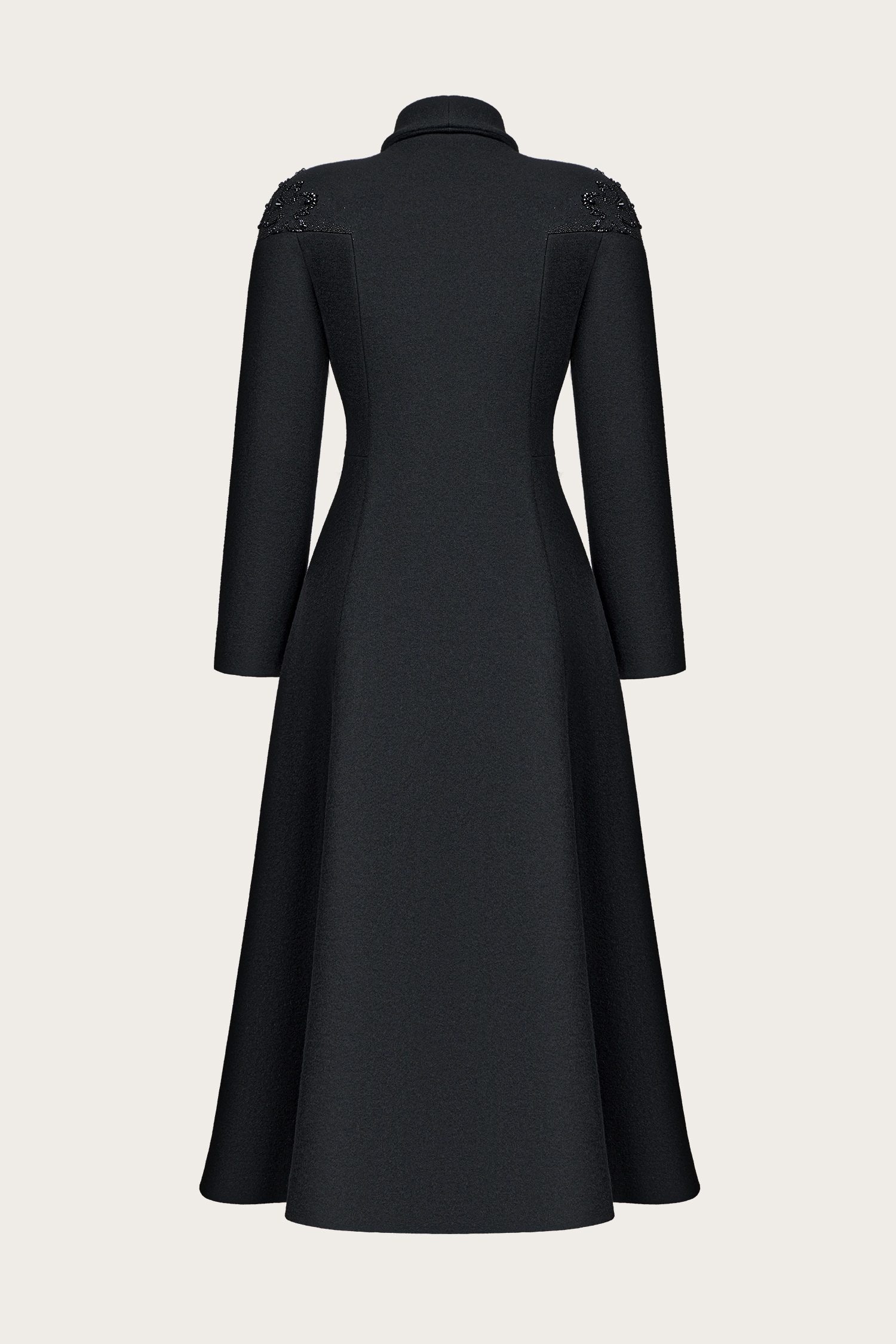Пальто из черного кашемира с расшитым вручную воротником. Воротник -хамут. Приталенный силуэт. Подкладка из шелка. Застежка на пуговицы по переду. Только сухая чистка. Сделано в России.