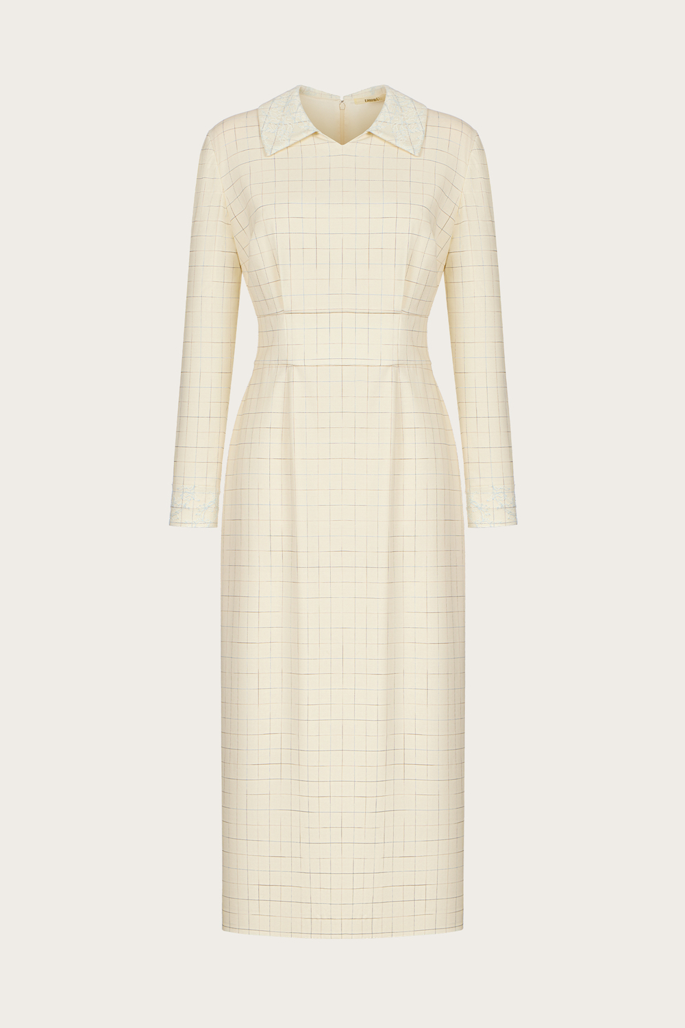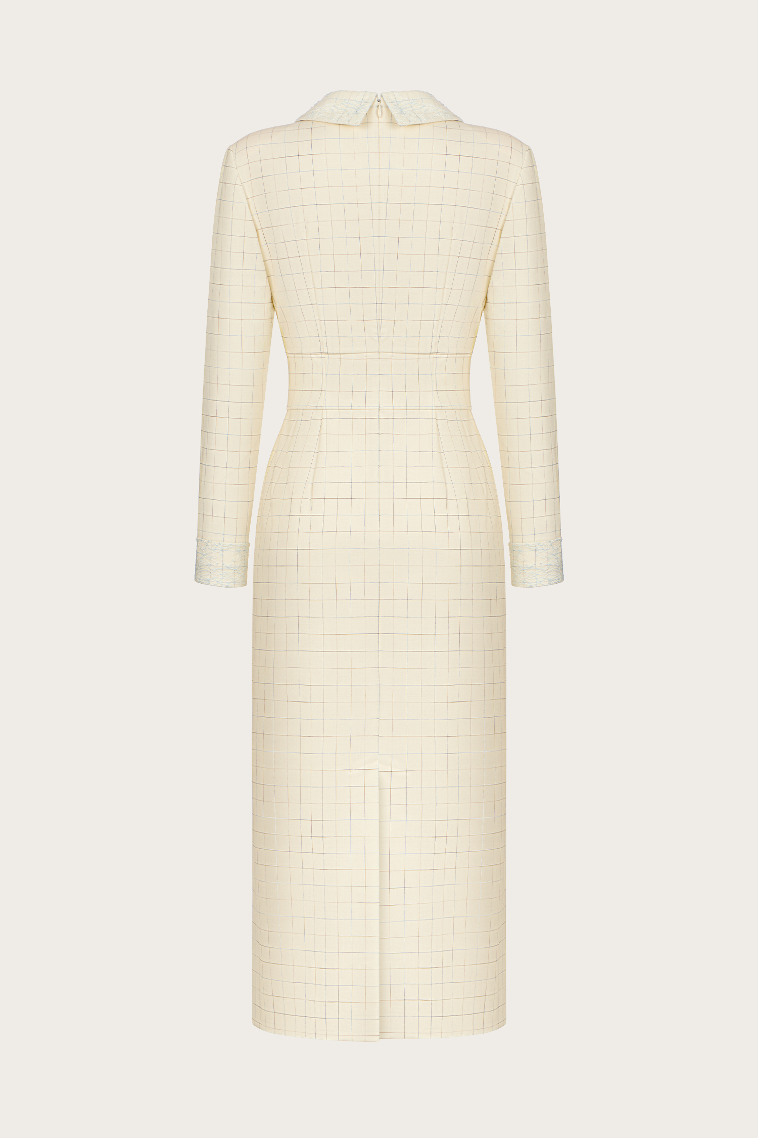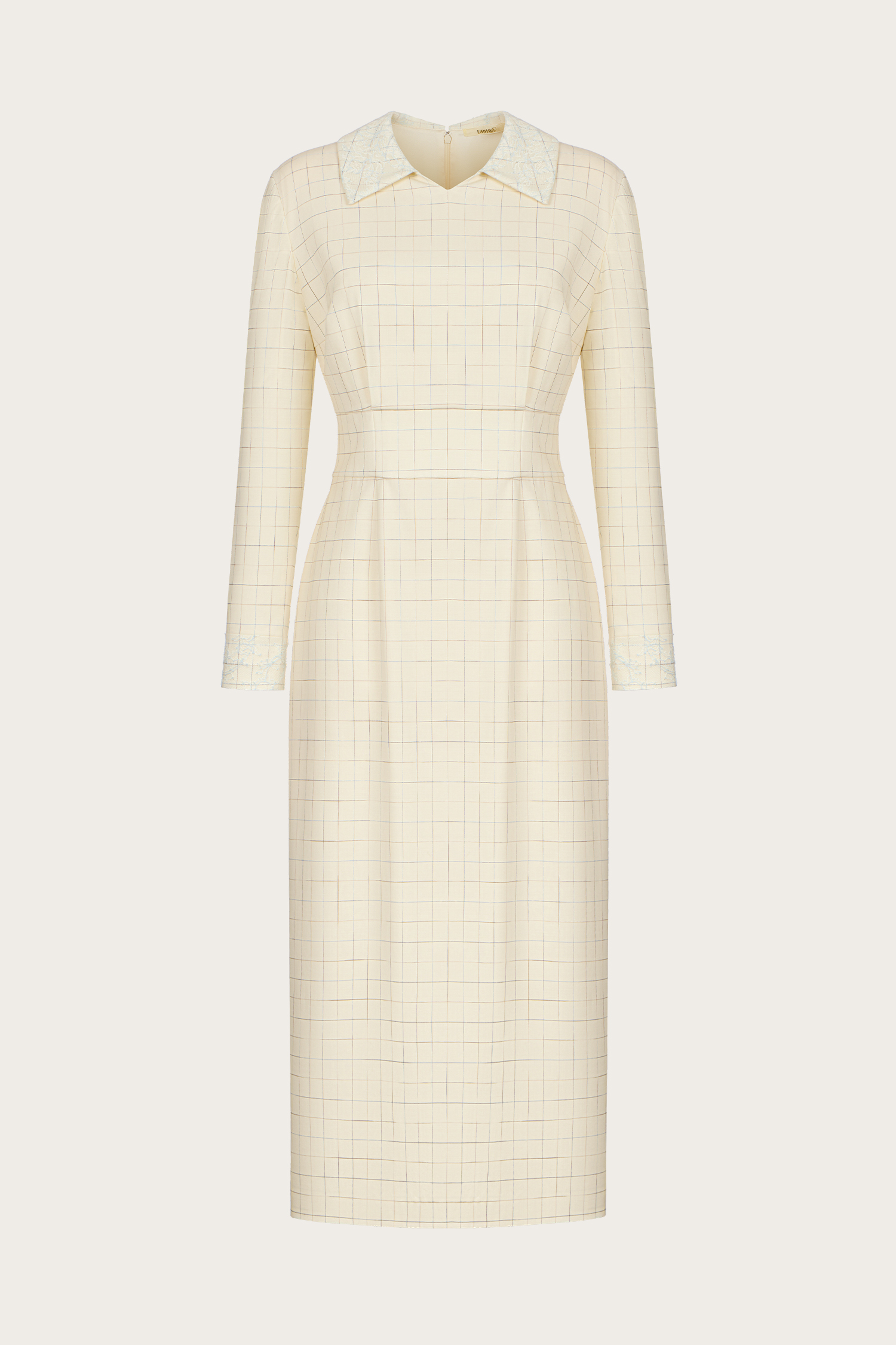 Платье длины миди, выполненное из молочной в клетку шерсти. Контрастные манжеты и воротник из кружева. Приталенный силуэт. Застежка на молнию и пуговицы по спинке. Подкладка из шерсти. Только сухая чистка. Сделано в России.