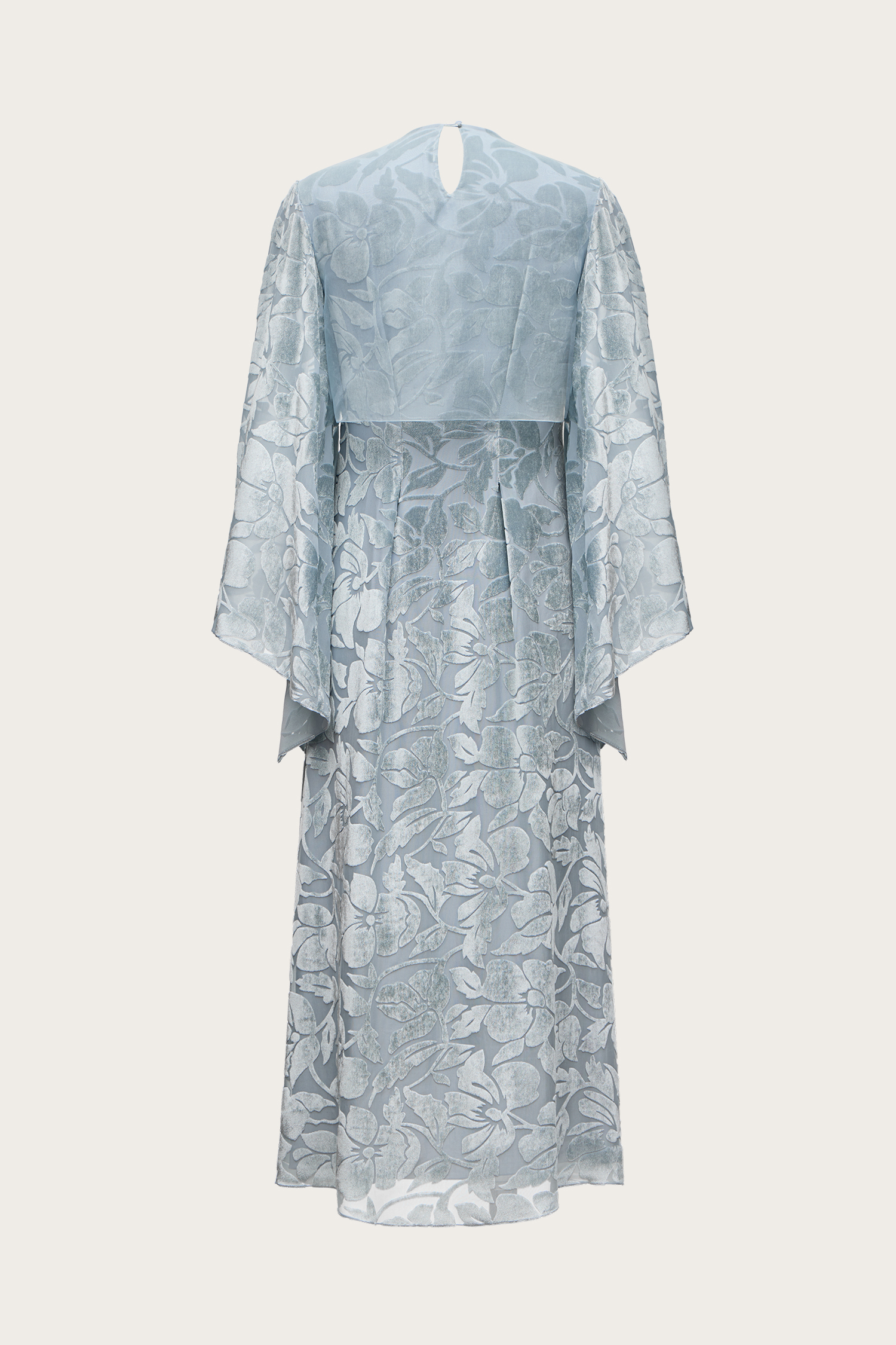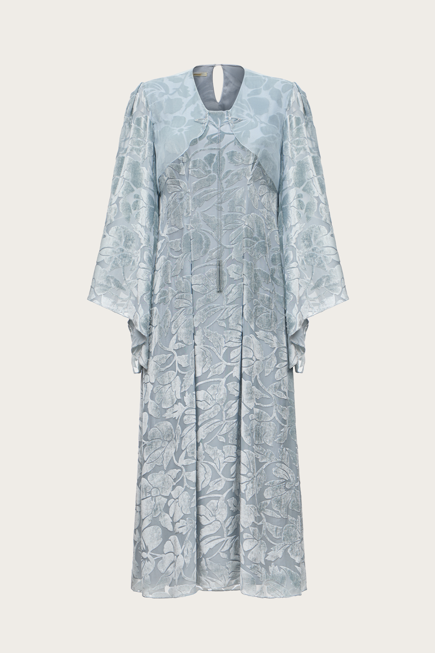 Платье миди из серого шелкового панбархата с шифоновым декоративным воротником и  авторской вышивкой. Расклешенные рукава. Свободный силуэт. Только сухая чистка. Сделано в России.