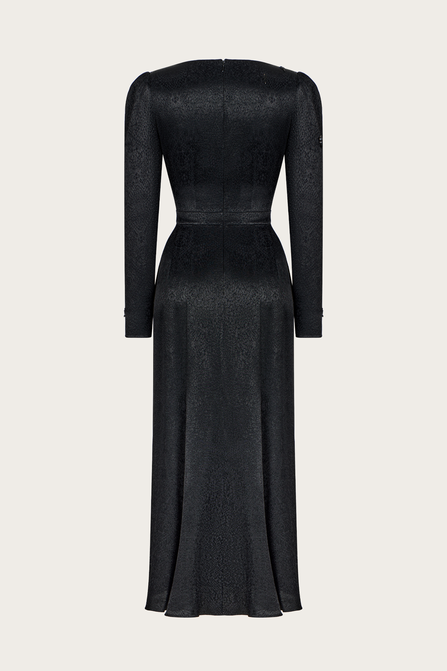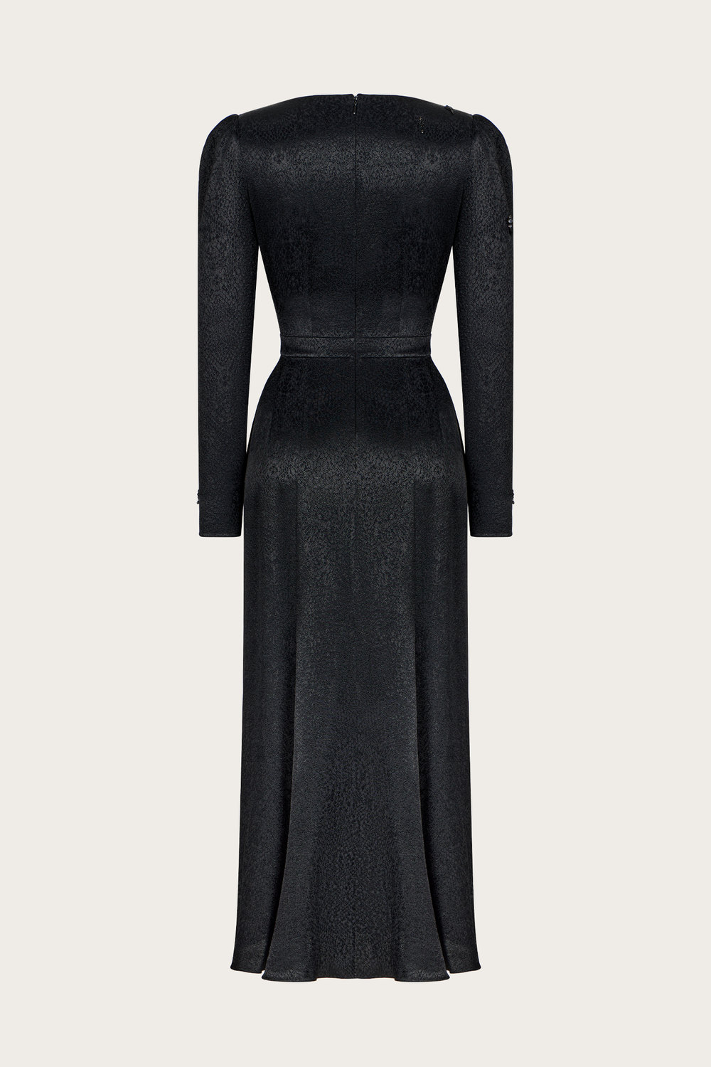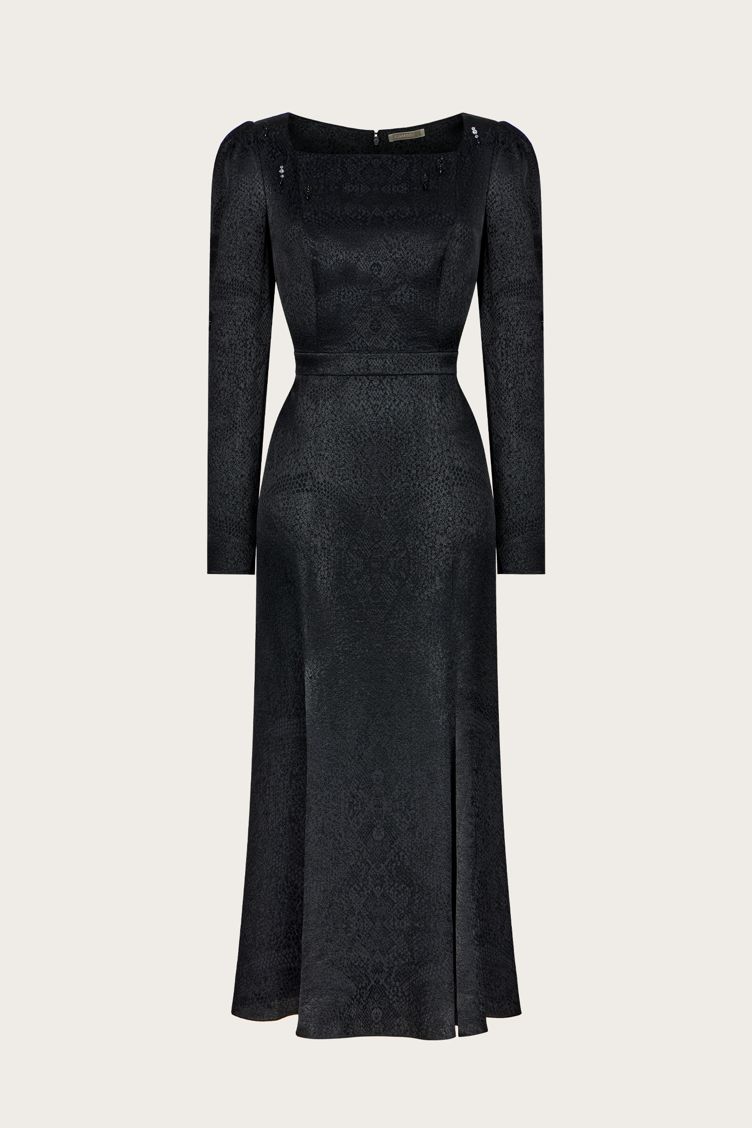 Платье миди из черной фактурной вискозы с ручной авторской вышивкой. Квадратный вырез. Приталенный силуэт. Застежка на молнию и крючок по спинке. Только сухая чистка. Сделано в России.