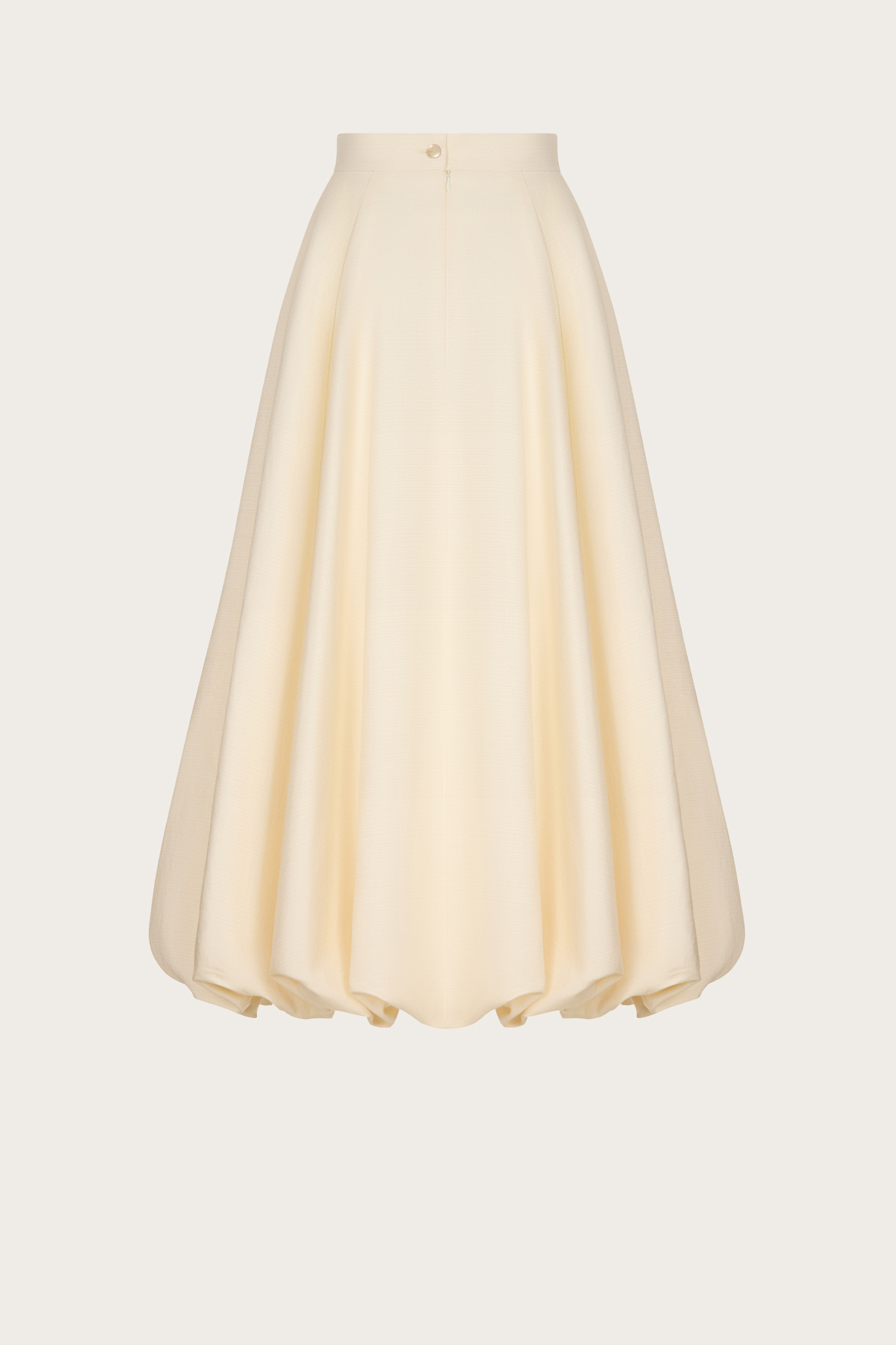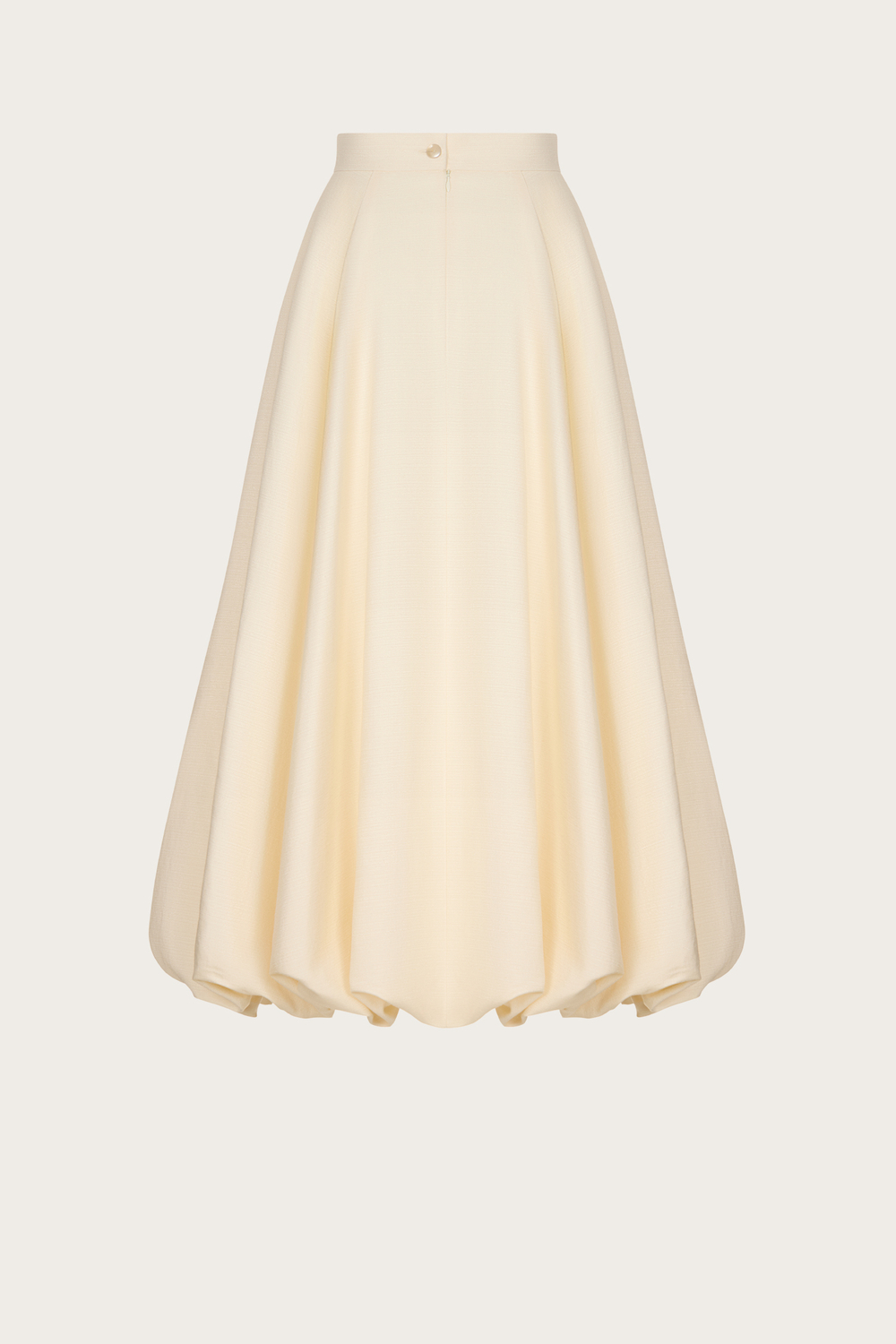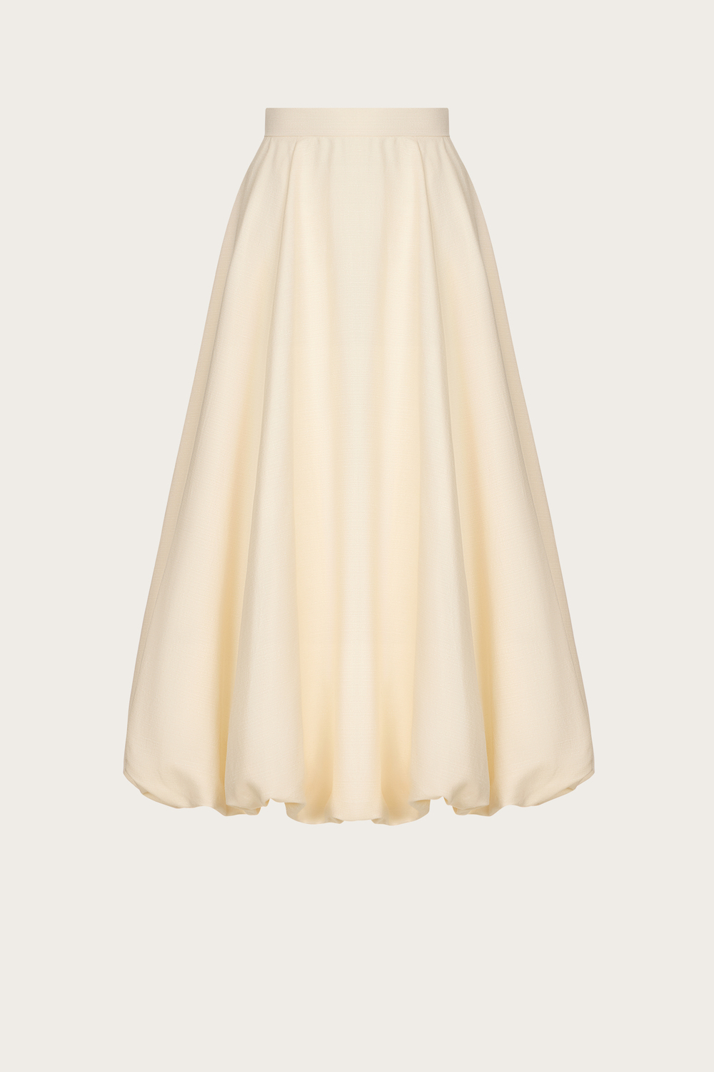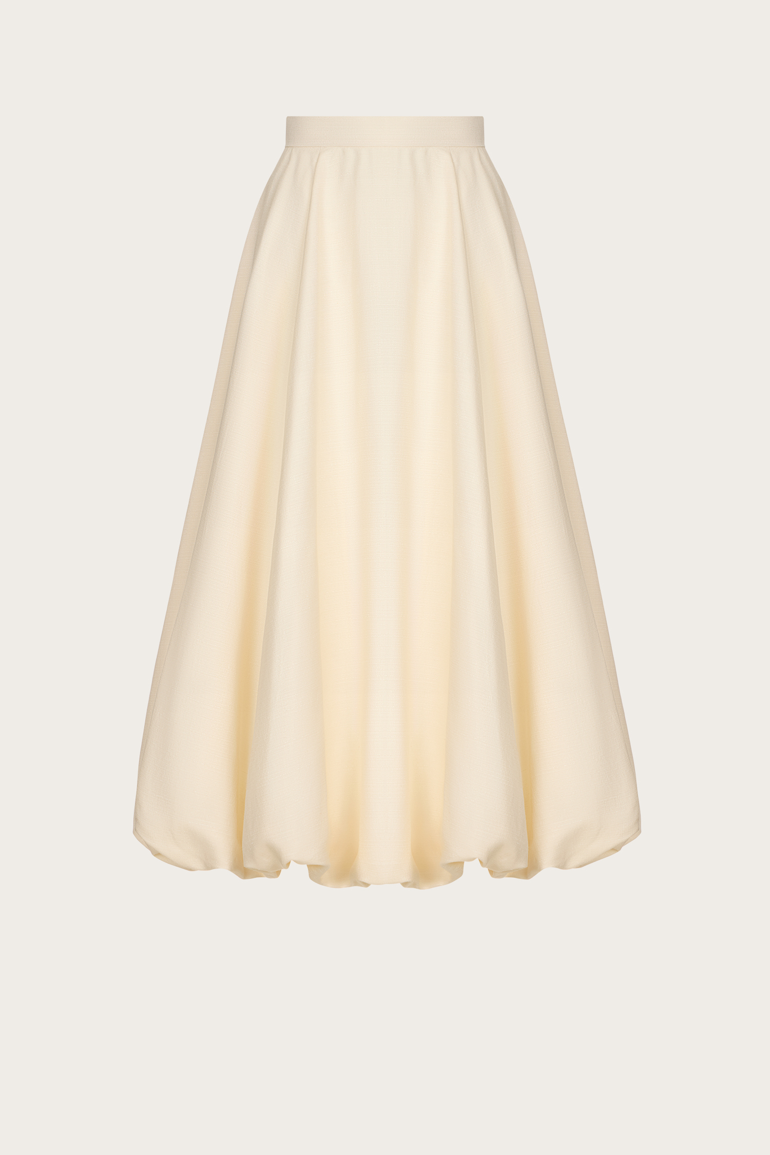 Объемная юбка миди из молочного шелка. Силуэтный пояс. Застежка на молнию и пуговицу по спинке. Только сухая стирка. Сделано в России.