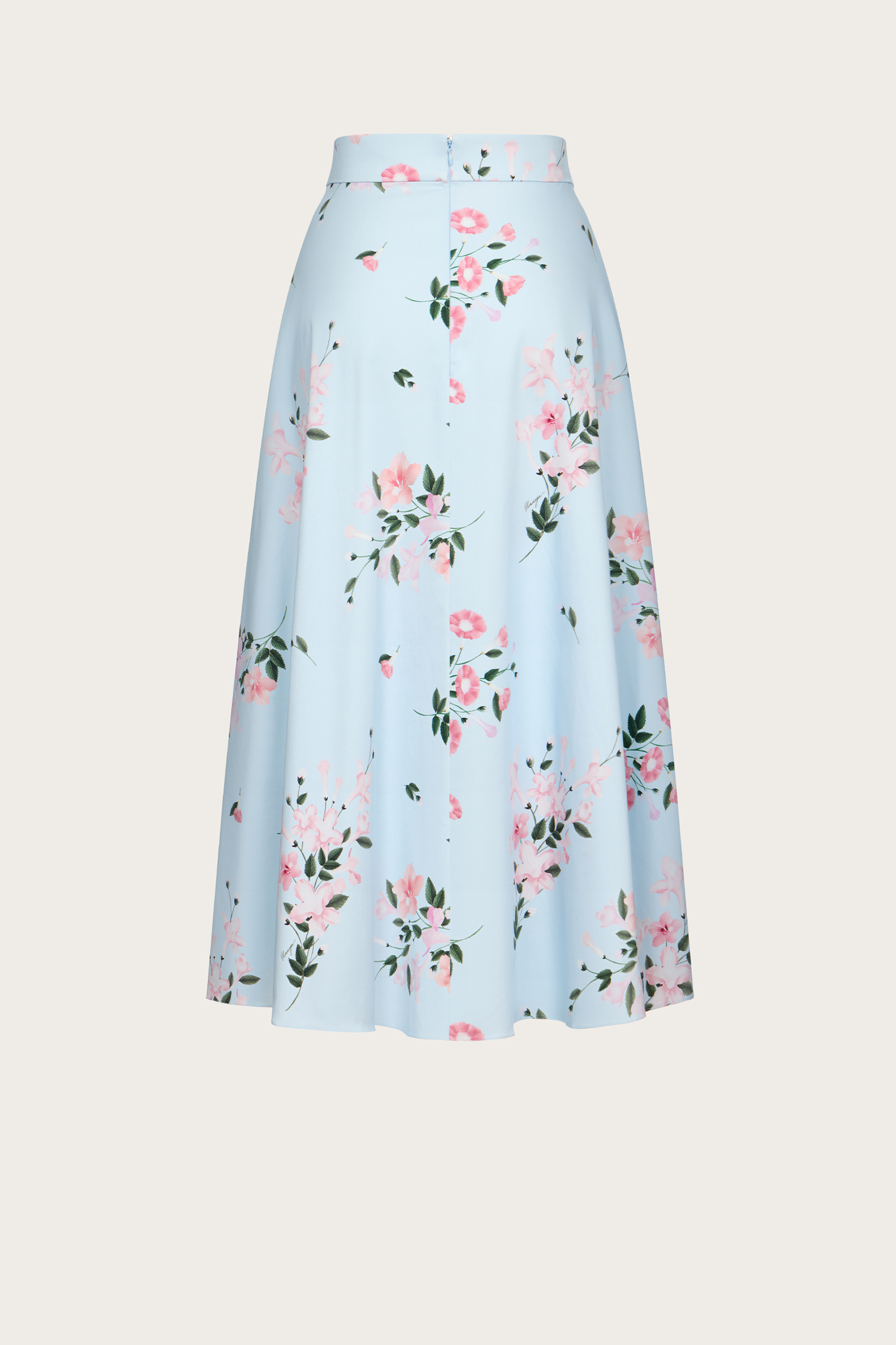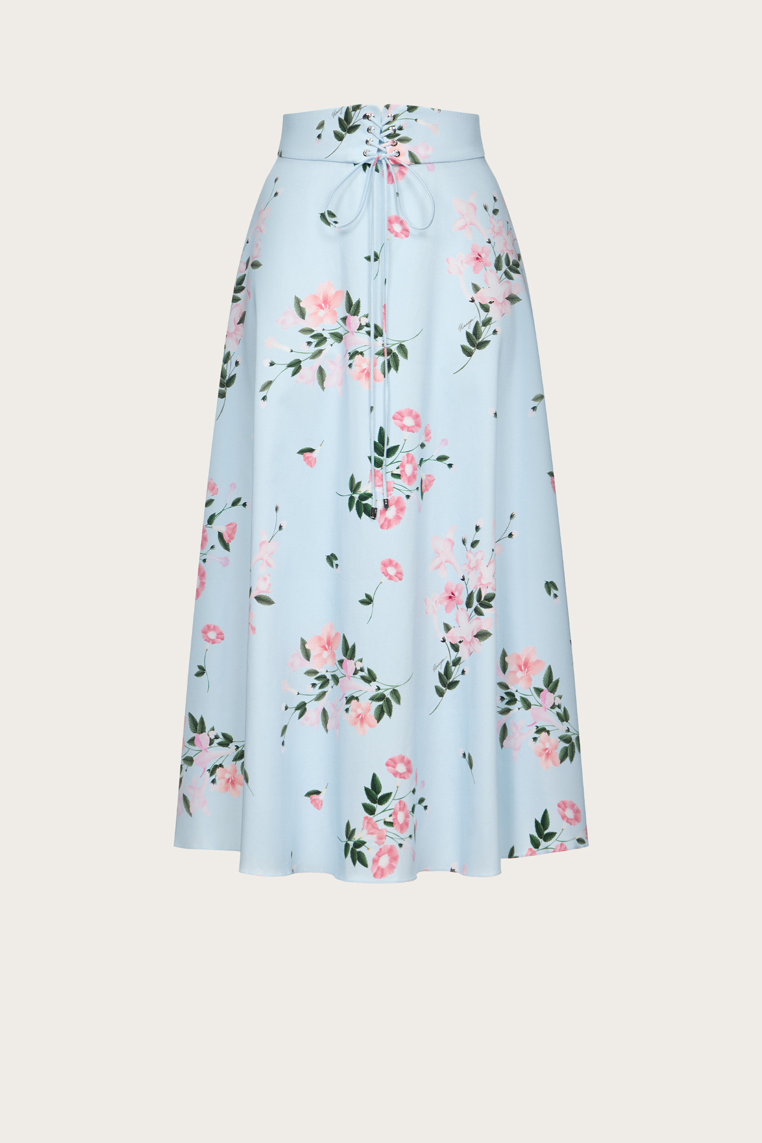 Юбка на шнуровке из голубого хлопка с авторским принтом. Застежка на молнию и пуговицу по спинке. Расклешенный силуэт. Только сухая чистка. Сделано в России.