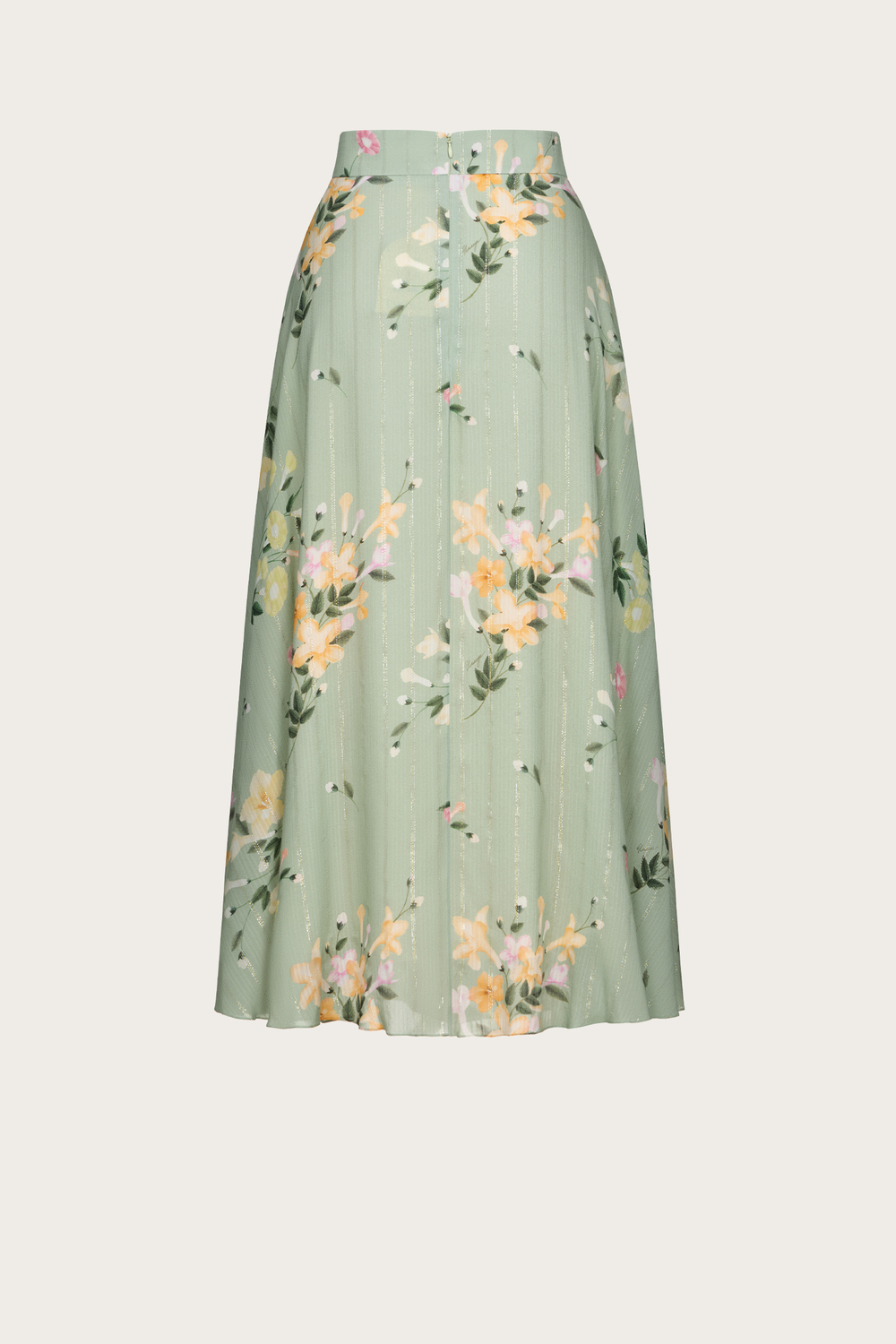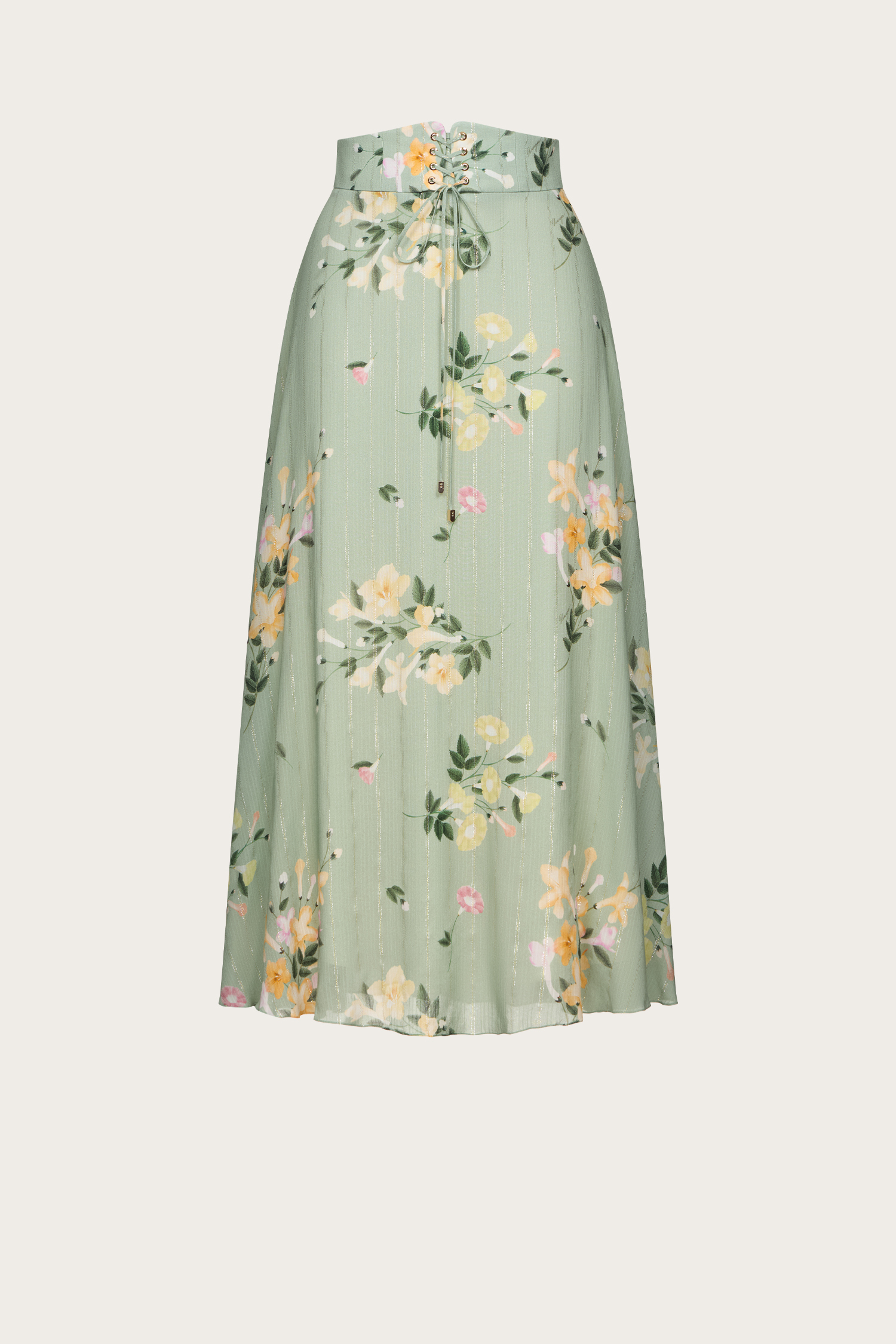 ЮБКА НА ШНУРОВКЕ ИЗ ЗЕЛЕНОЙ ВИСКОЗЫ С ЛЮРЕКСОМ И АВТОРСКИМ ПРИНТОМ