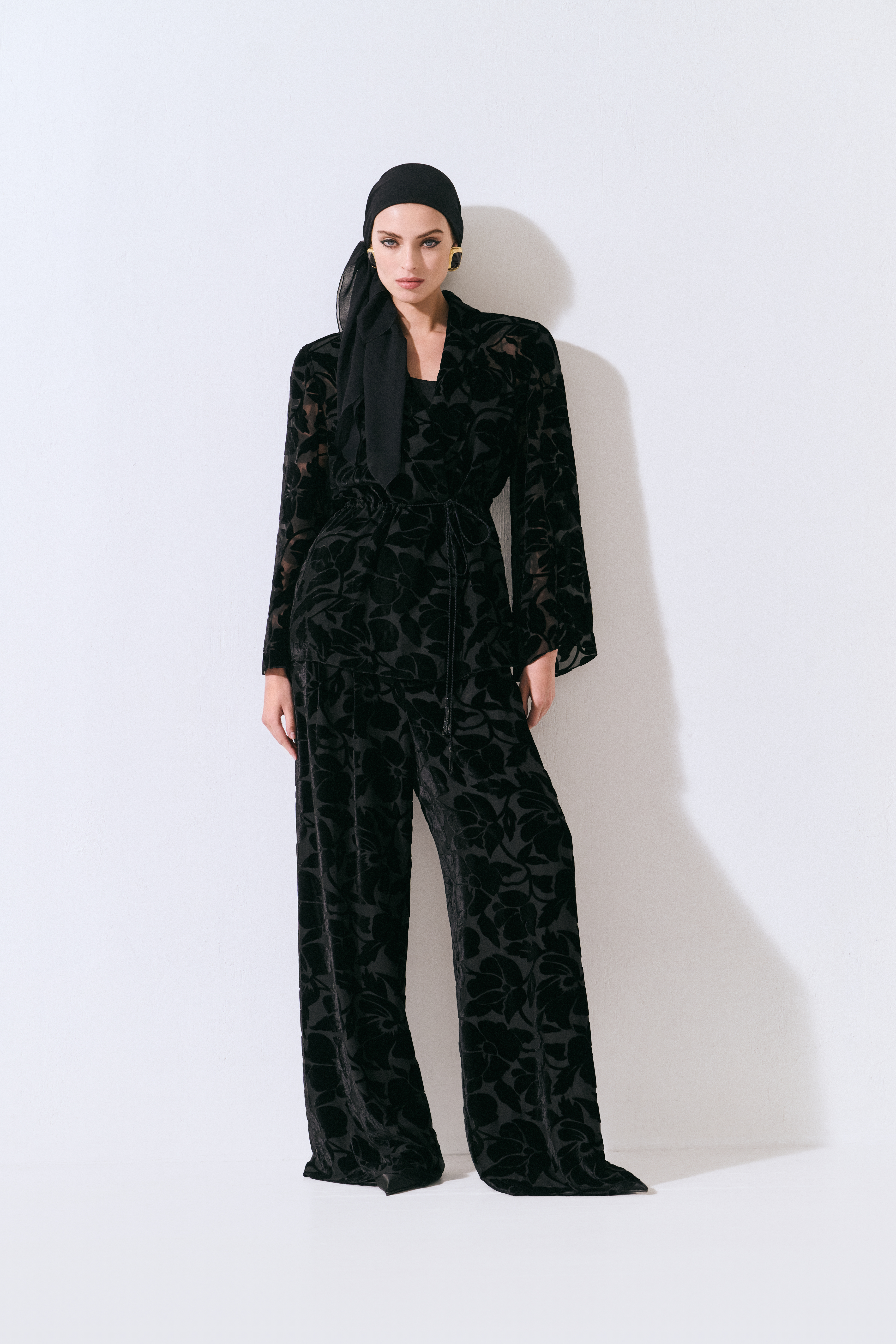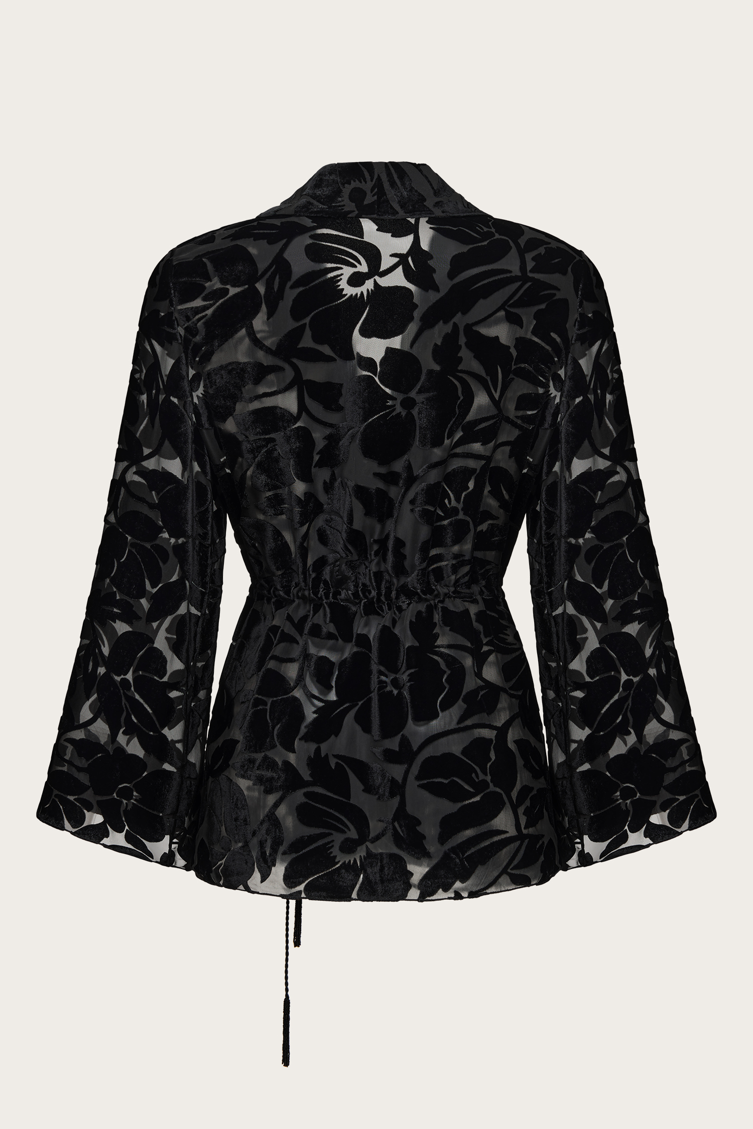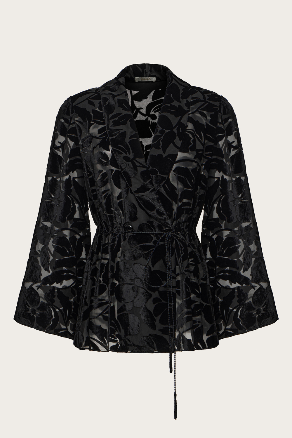 Жакет из черного шелкового панбархата с воротником. Отложной воротник. Свободный силуэт. Завязка на тонкий пояс с кисточками. Только сухая чистка. Сделано в России.