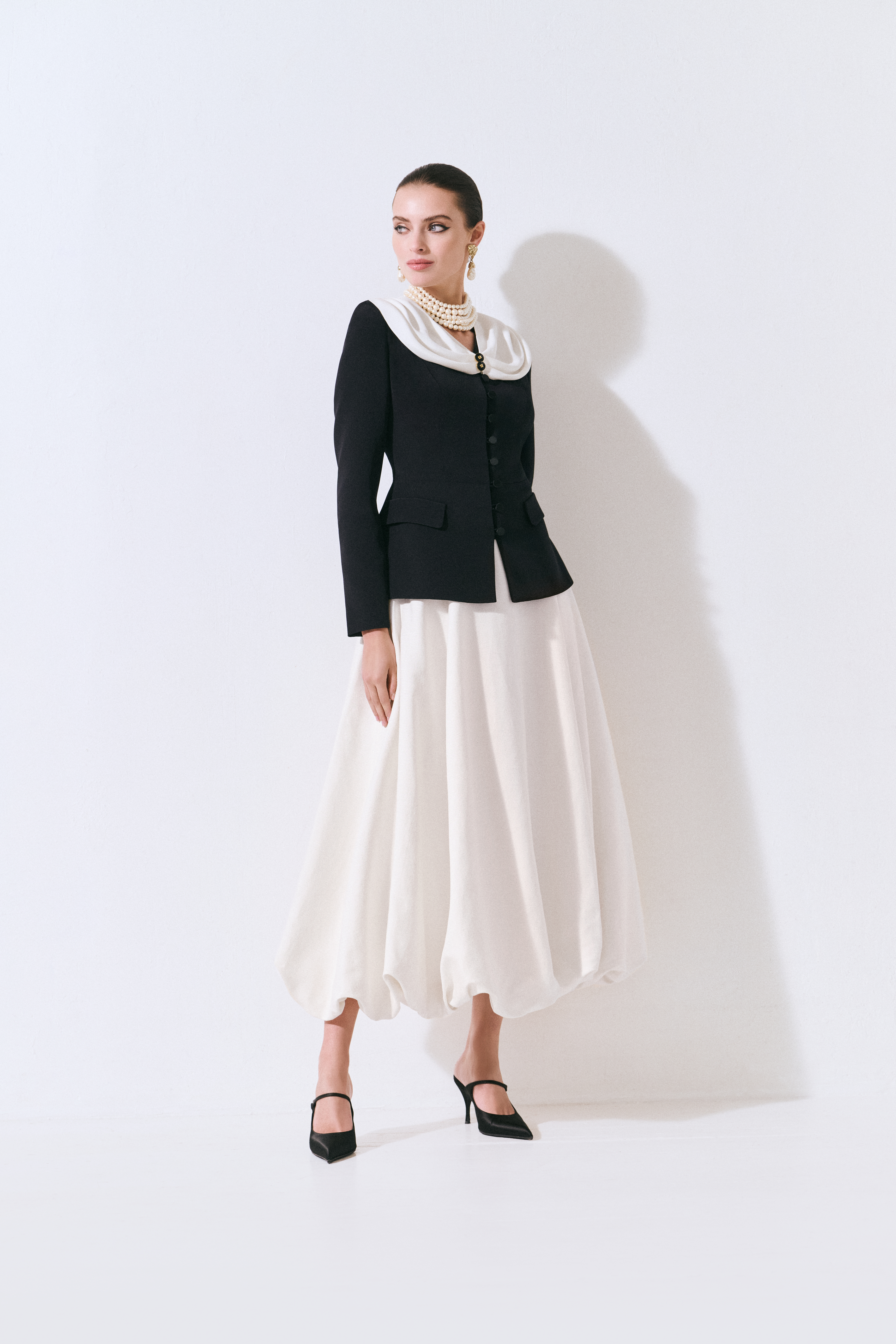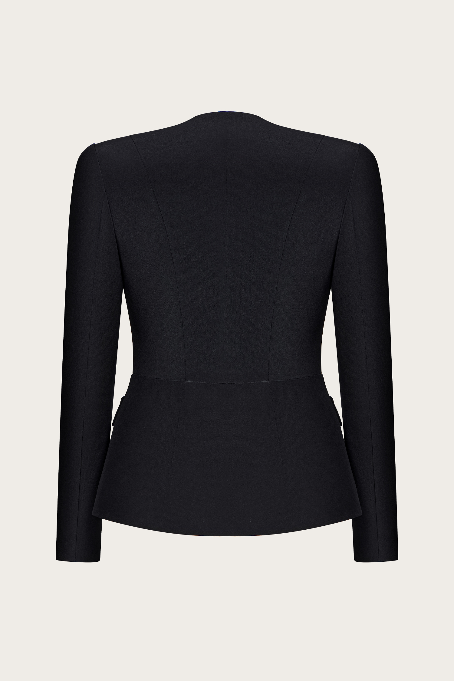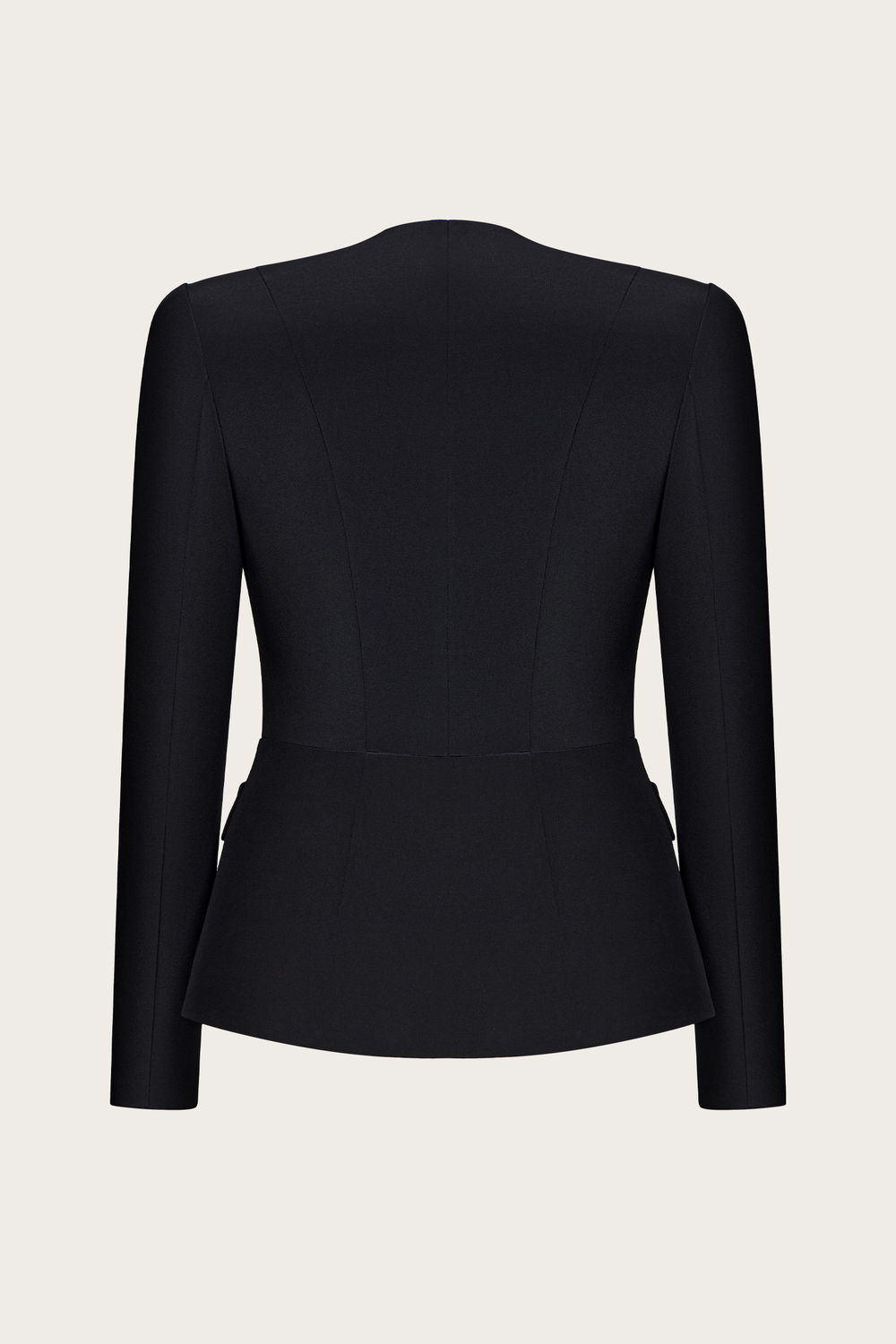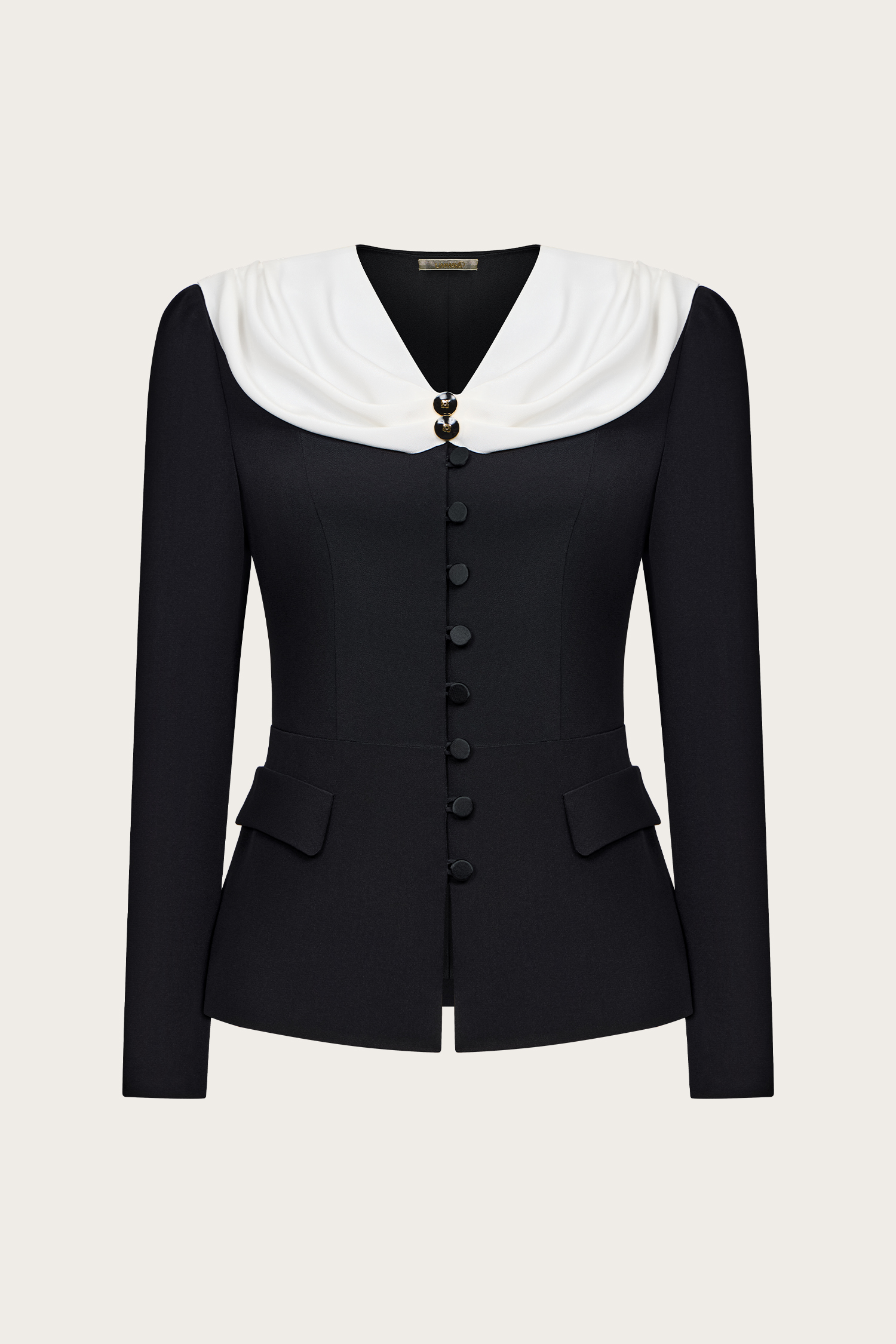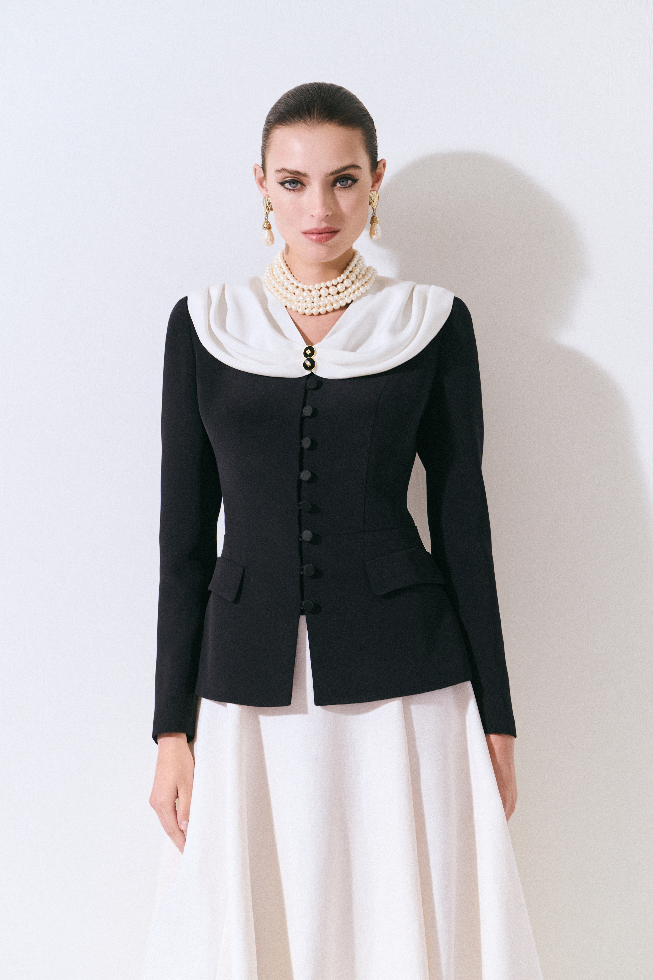 Приталенный жакет из  черного шелкового кади. Съемным воротник из шелка с декоративными пуговицами. Приталенный силуэт. Застежка на пуговицы по переду. Только сухая чистка. Сделано в России.
