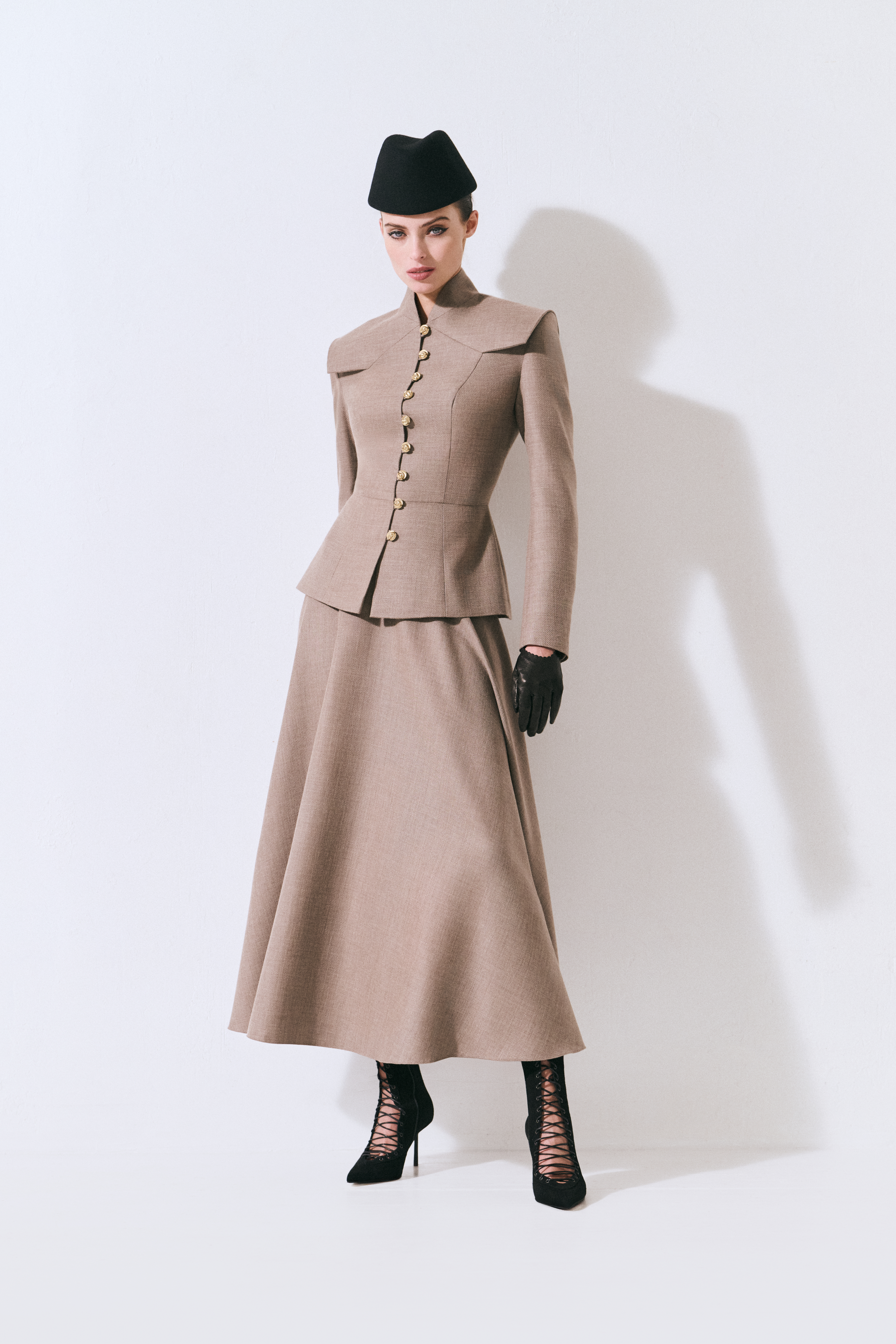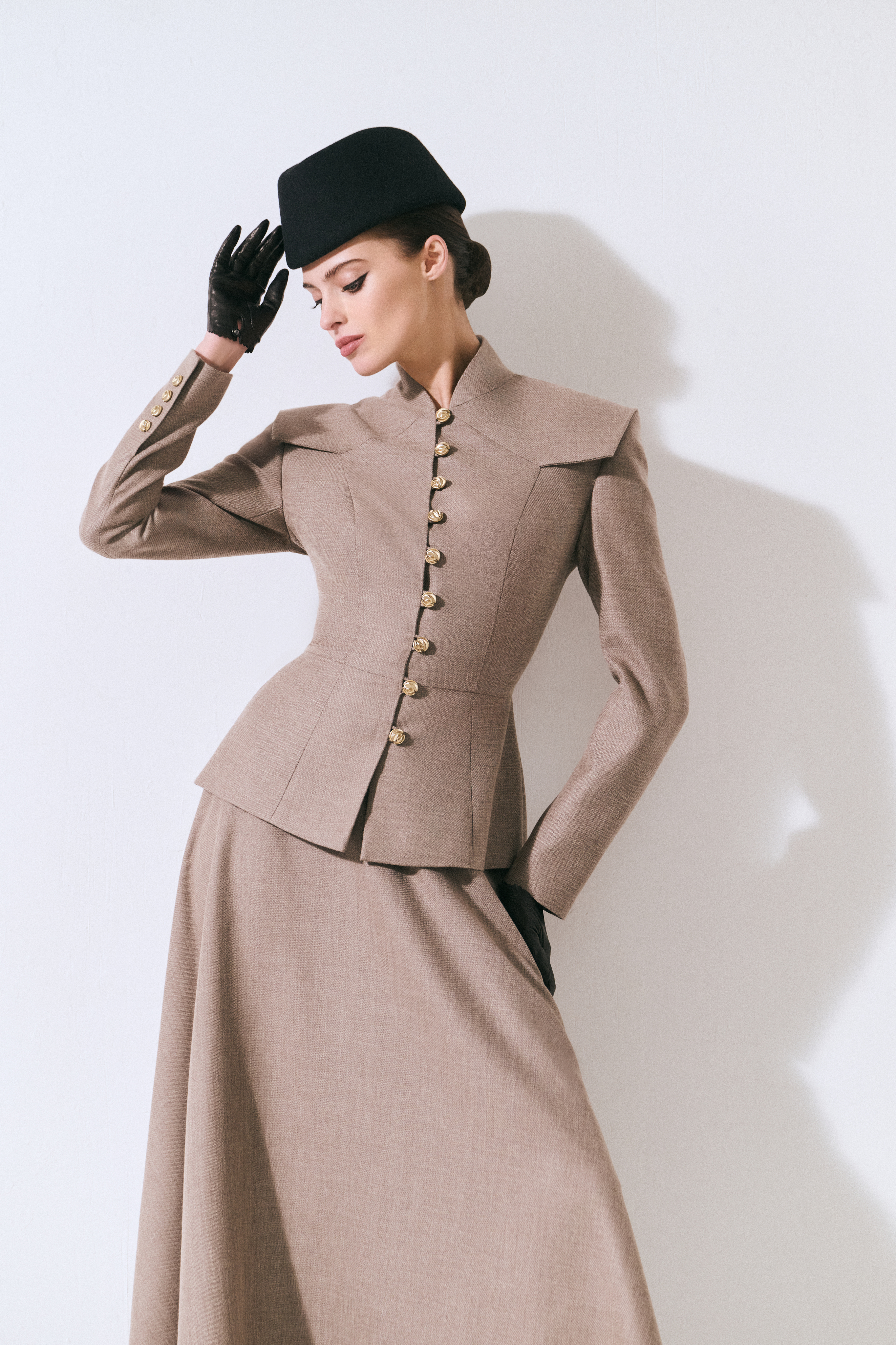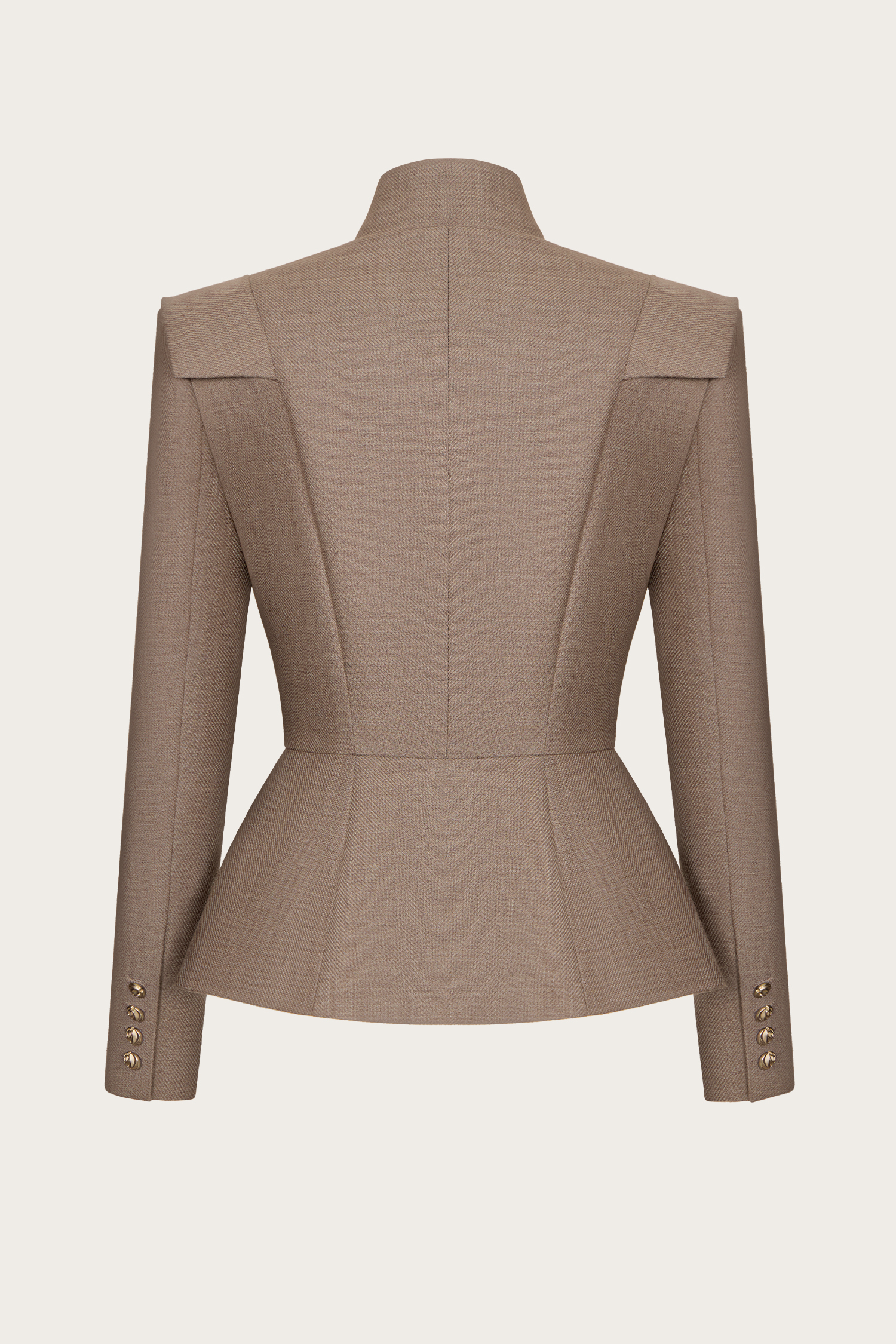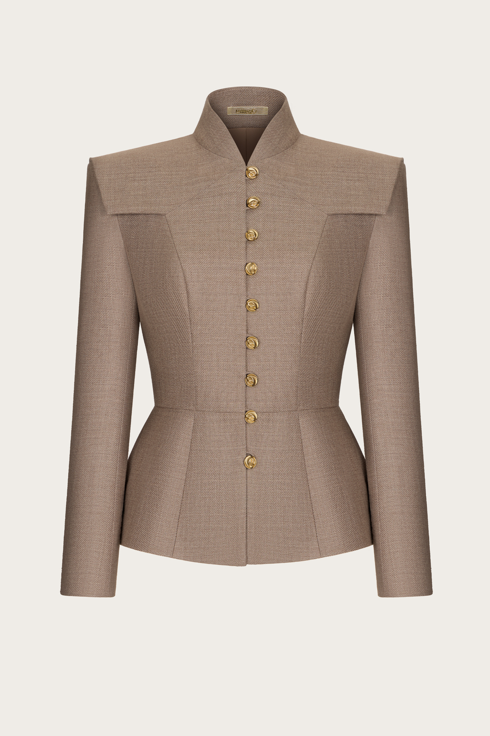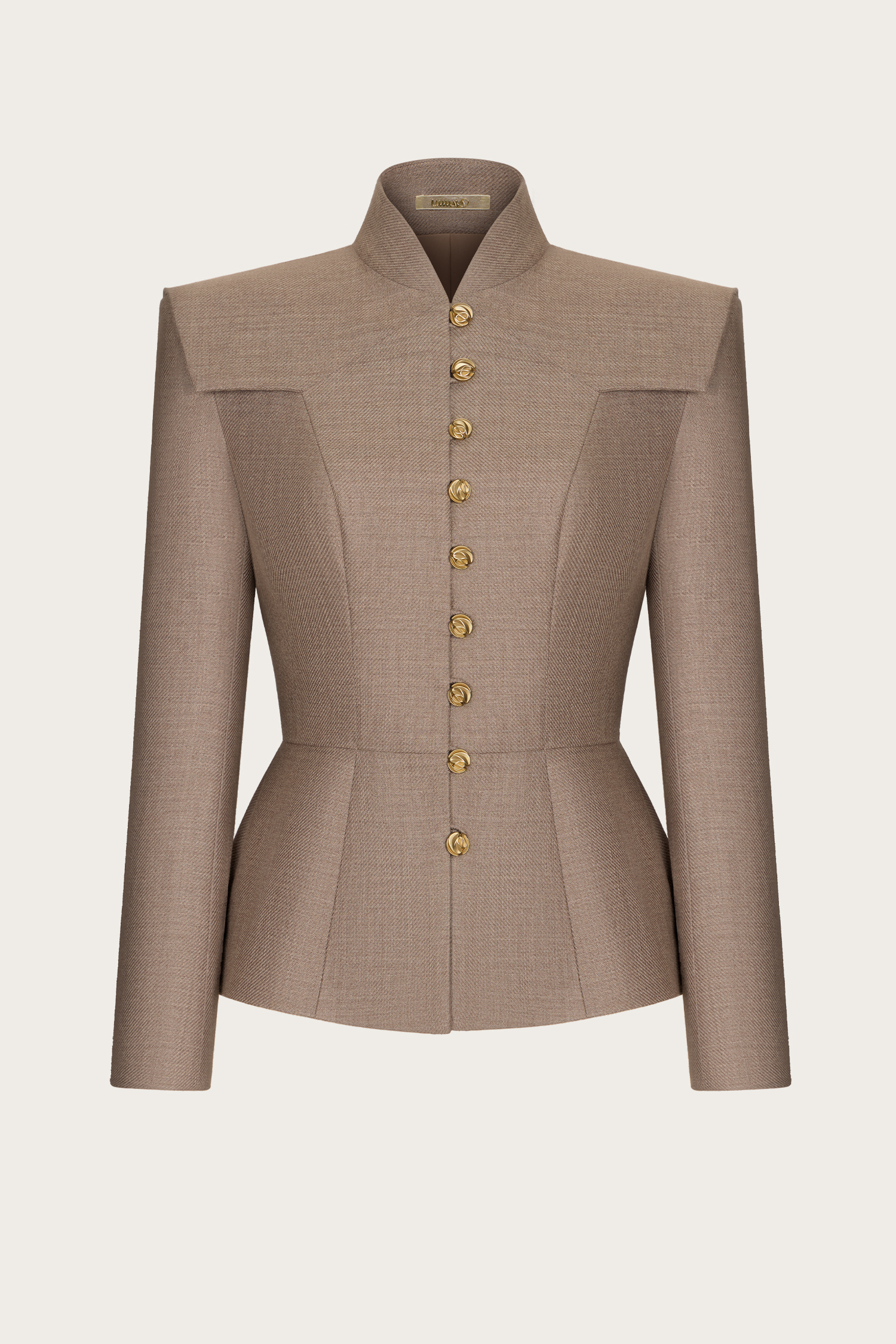 Приталенный жакет из бежевой шерсти. Воротник-стойка. Декоративные пуговицы. Только сухая чистка. Сделано в России.