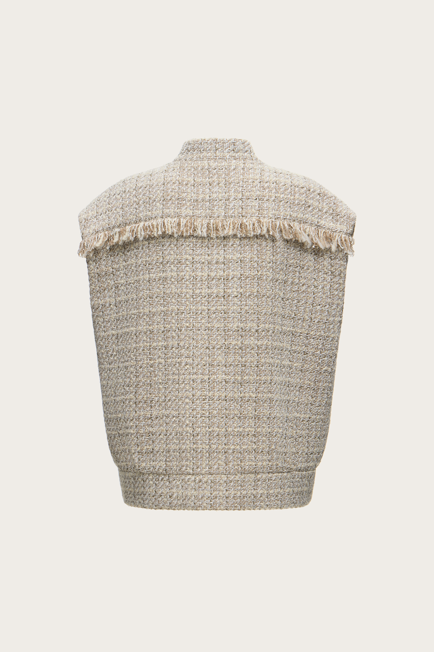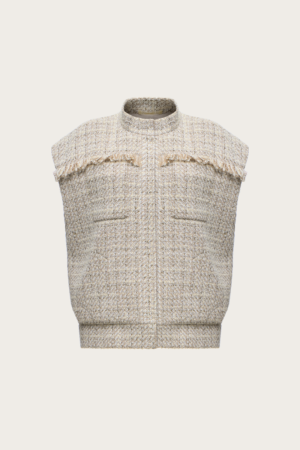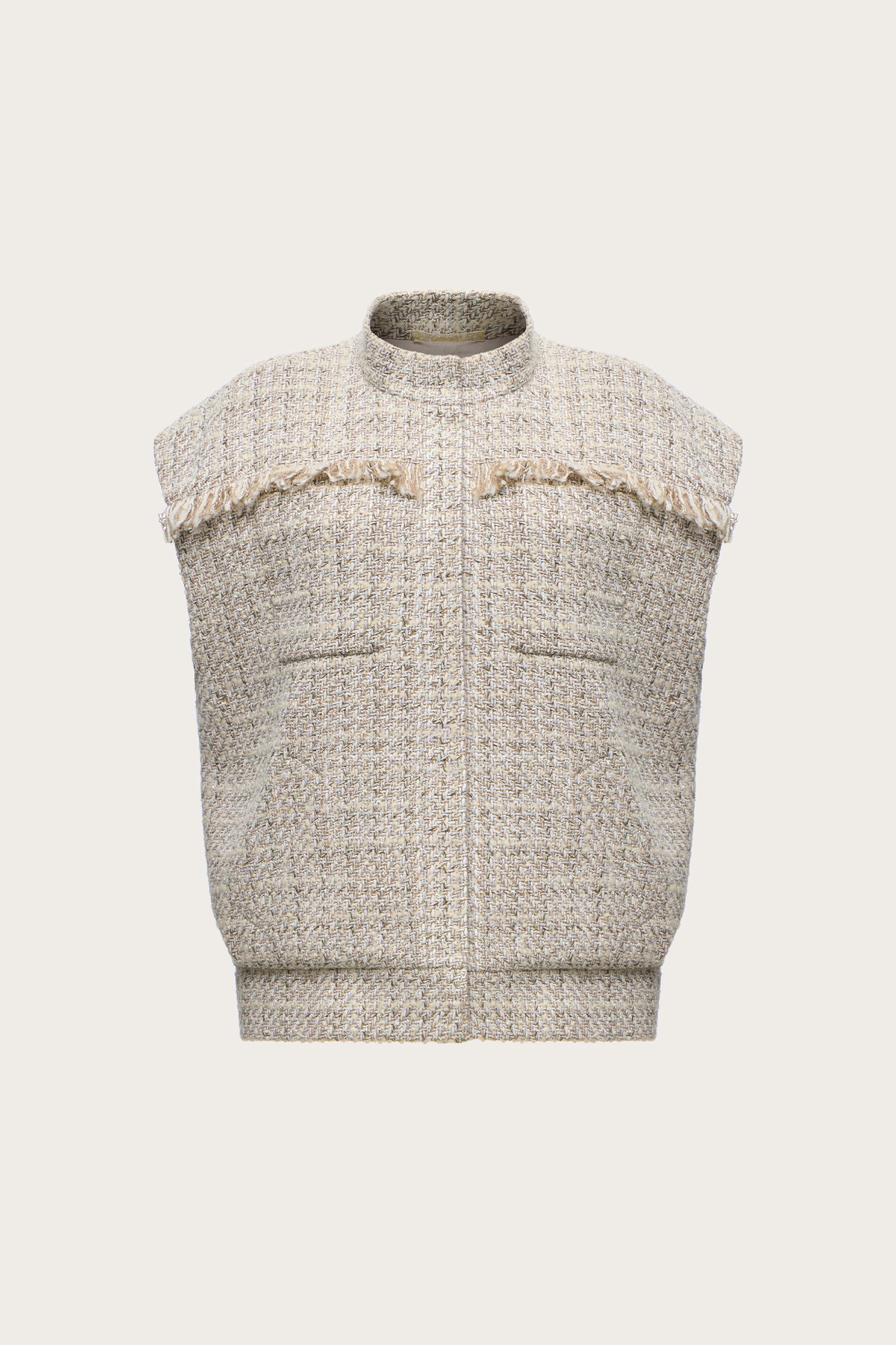 Жилет из бежевого шерстяного твида с люрексной нитью. Воротник - стойка. Свободный силуэт. Застежка на кнопки по переду. Только сухая чистка. Сделано в России.