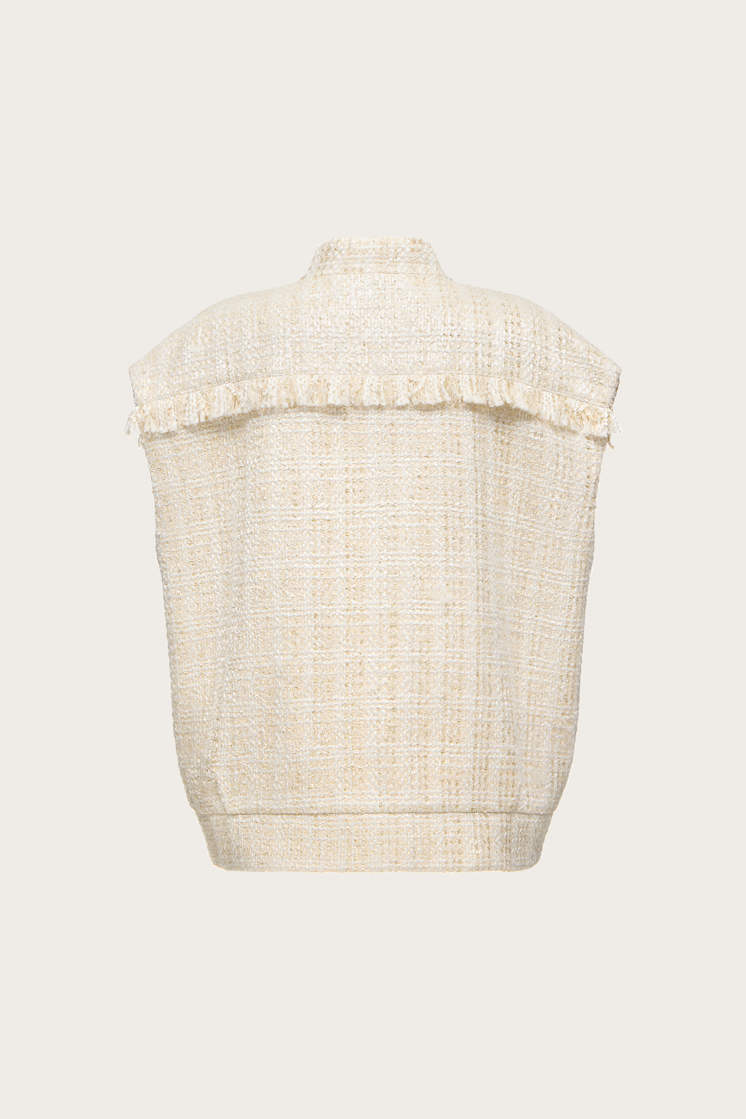 Жилет из молочного твида с люрексной нитью. Воротник - стойка. Свободный силуэт. Застежка на кнопки по переду. Только сухая чистка. Сделано в России.
